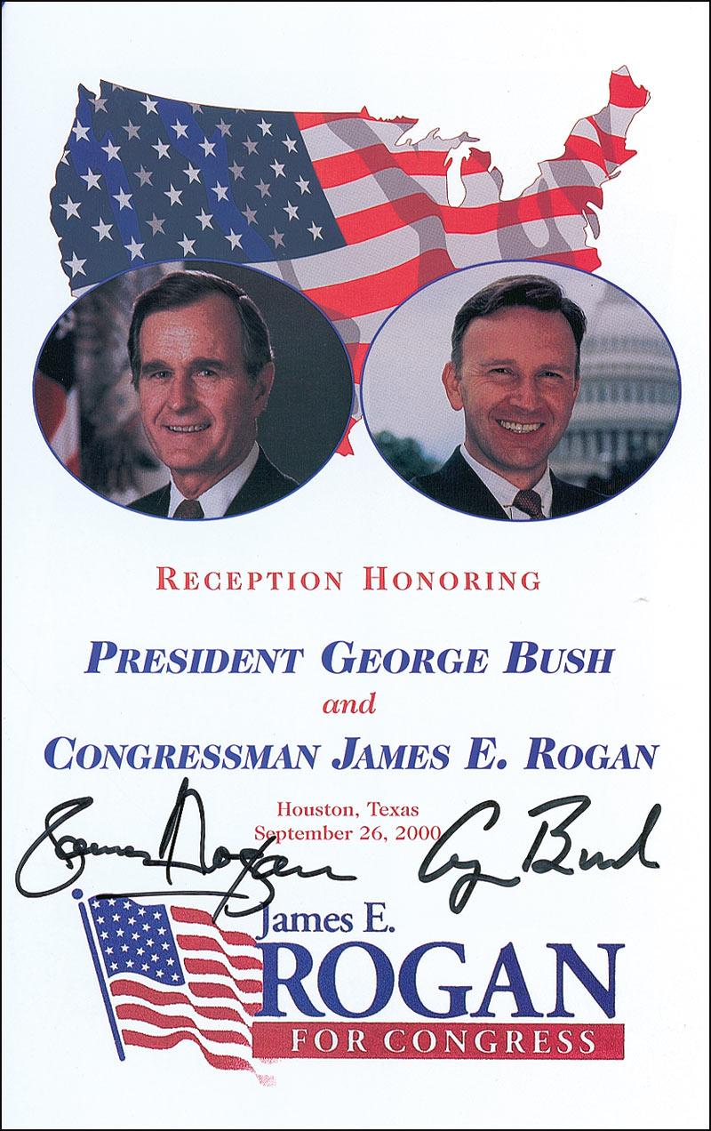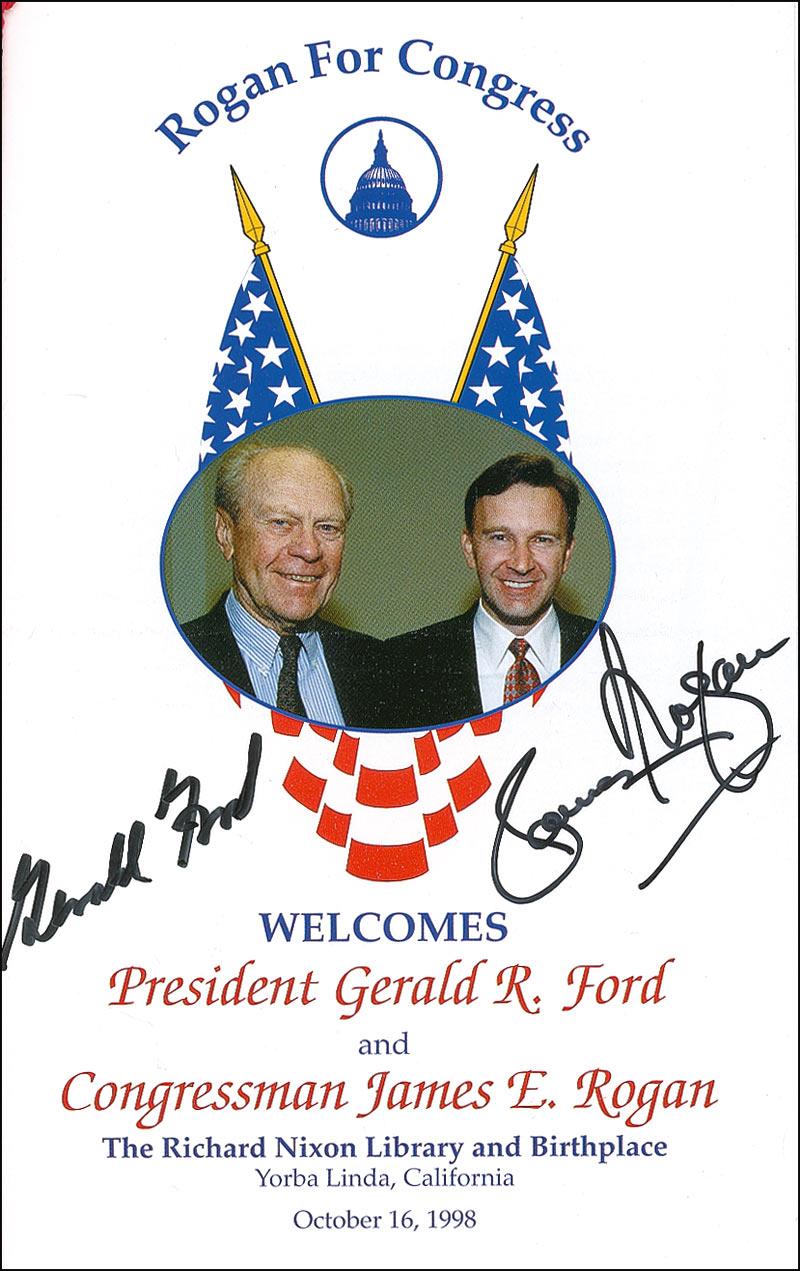 Two items: a program from a fundraiser for Congressman James E. Rogan’s re-election campaign on October 16, 1998, 5.5 x 8.5, signed on the cover in black felt tip by Gerald Ford and Rogan; and a program from a September 26, 2000, reception, 5.5 x 8.5, signed on the cover in black felt tip by George Bush and Rogan. In overall fine condition. Accompanied by a candid photo of Ford signing the item and a letter of authenticity from Congressman Rogan regarding his meeting with Bush.