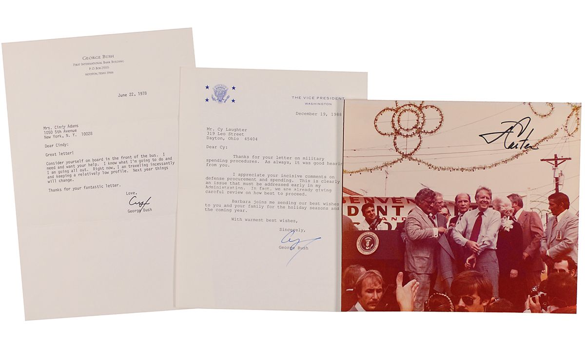 Three items: Two one-page TLSs, each signed “George,” one from 1978 and one from 1988. The 1988 letter reads, in part: “I appreciate your incisive comments on defense procurement and spending. This is clearly an issue that must be addressed early in my Administration.”; and a color satin-finish 10 x 8 photo of Jimmy Carter on the campaign trail, signed in black felt tip, “J. Carter.” In fine condition.