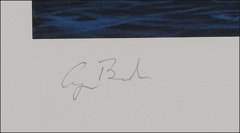 Color limited edition 32 x 24 lithograph of the USS George H. W. Bush, numbered #66/200, signed in pencil. Also signed in pencil by the artist, Stan Stokes. Rolled and in fine condition.