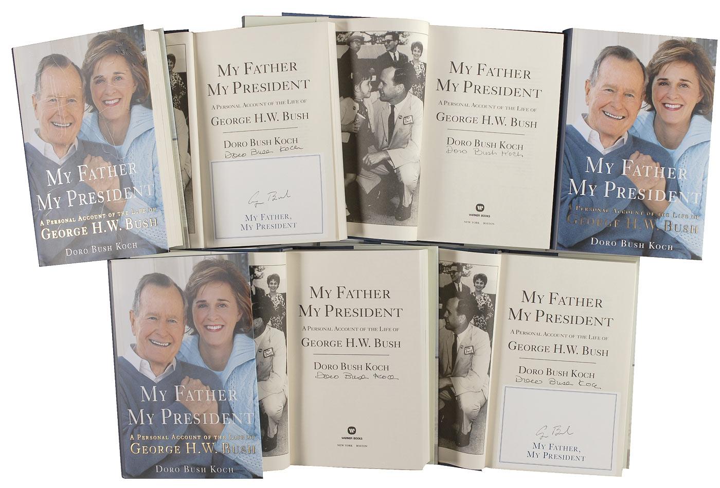 Three hardcover copies of My Father My President, each signed in black ink by Bush on a bookplate affixed to the title page, with each title page also signed by Doro Bush Koch. In very fine condition. Accompanied by four more copies of the book, each signed by Doro Bush Koch only. Some of the dustjackets of the accompaniments exhibit scattered surface wear, with a tear to one first free end page.