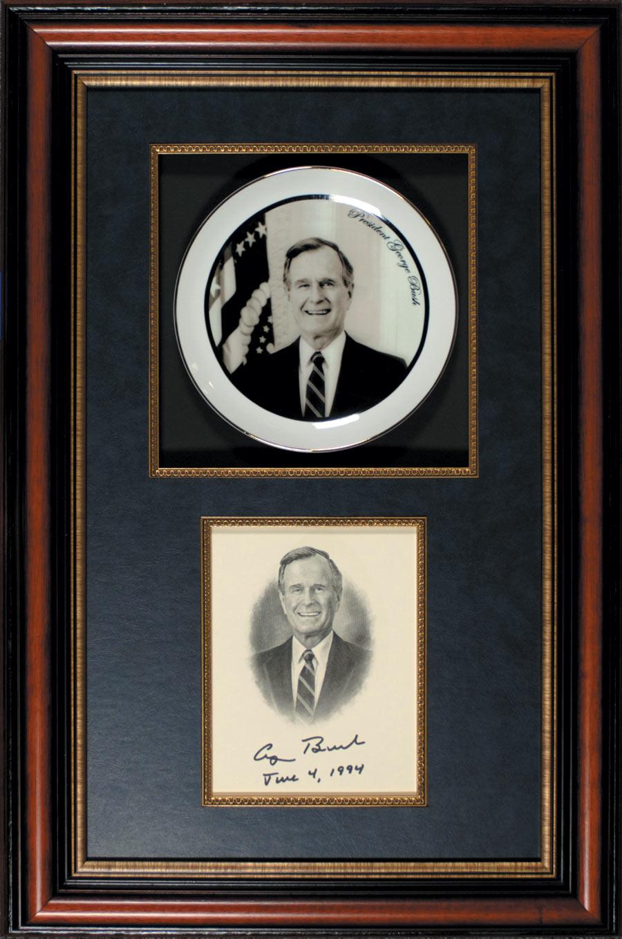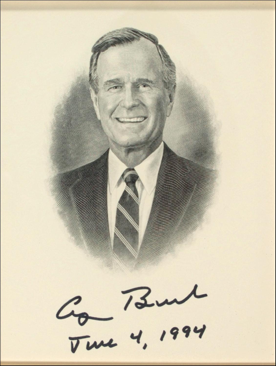 Engraved portrait, 5.75 x 7.75, by the Bureau of Engraving and Printing, signed in black felt tip below the image, “George Bush, June 4, 1994.” Shadow box framed with a commemorative portrait plate to an overall size of 18 x 27. In very fine condition. Oversized.