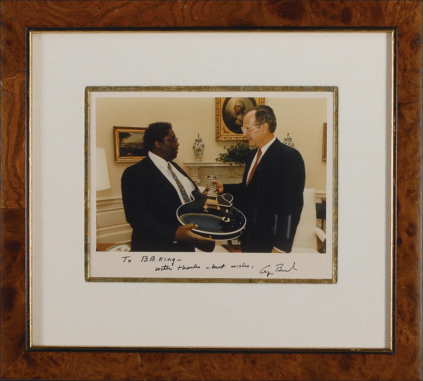 Color satin-finish 9.5 x 7.25 photo of B. B. King presenting President George Bush with a ‘Lucille’ model Gibson guitar, signed and inscribed in black felt tip “To B. B. King—with thanks & best wishes, George Bush.” Double cloth matted and framed to an overall size of 17.25 x 15.25. In fine condition, with a couple of faint bends and surface marks. Bush and the blues legend met on several occasions, with this image taken during their first encounter in June 1989 in the Oval Office.