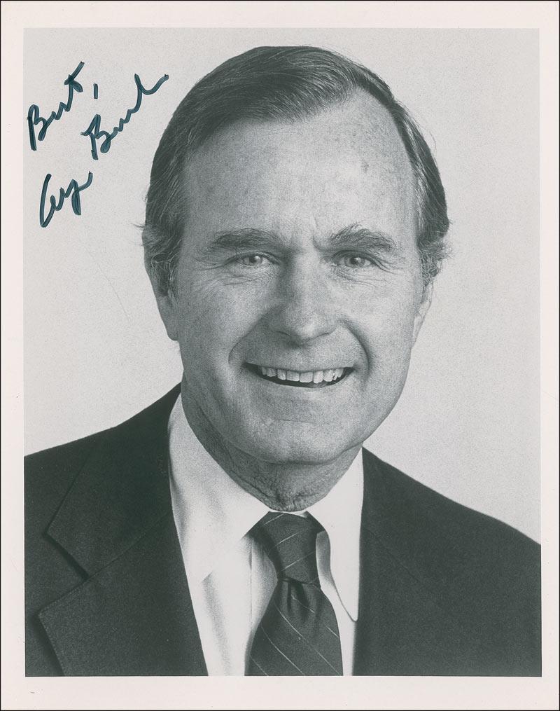Glossy 8 x 10 head-and-shoulders photo, signed in black felt tip, “Best, George Bush.” In fine condition, with scattered light creases and surface marks to photo. Accompanied by a 1980 TLS, bearing an autopen signature of Bush, acknowledging the photo.