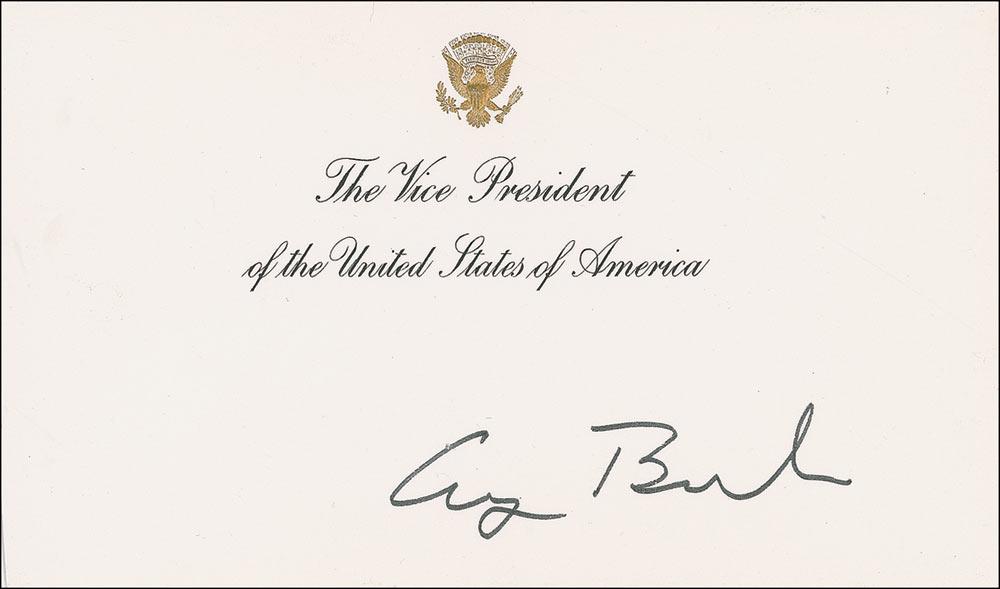 Felt tip signature, “George Bush,” on an off-white 6 x 3.5 embossed Vice President of the United States card. In fine condition, with a trimmed left edge.