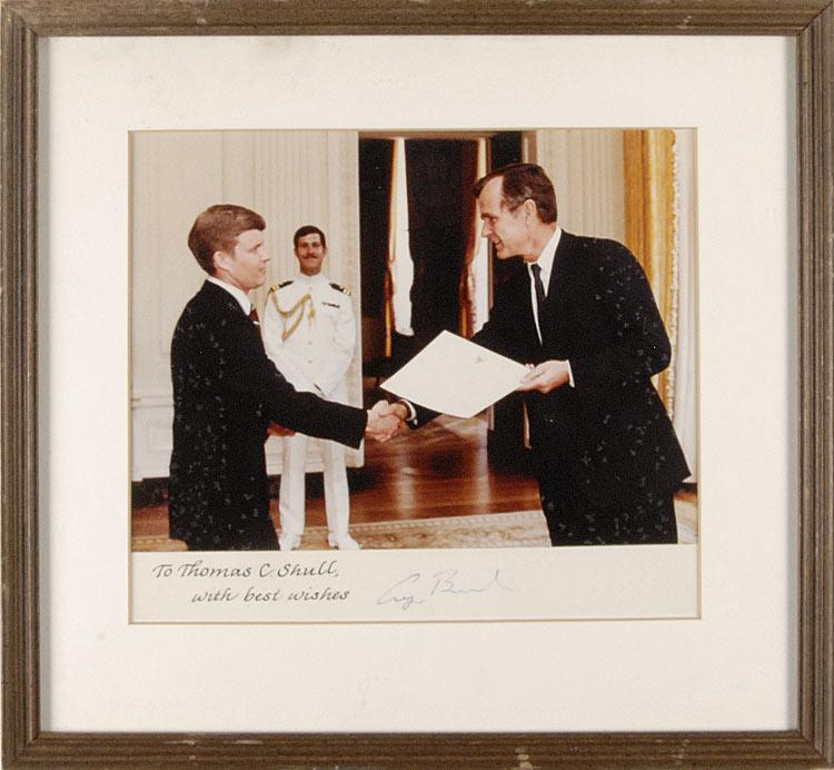 Color satin-finish 8.25 x 7.25 photo of Bush presenting a citation to another man, inscribed in a calligrapher’s hand “To Thomas C. Shull, with best wishes,” and signed in blue felt tip, “George Bush.” Matted and framed to an overall size of 12.25 x 11.5. In fine condition, with a few light ripples and creases, and dust inside of frame.
