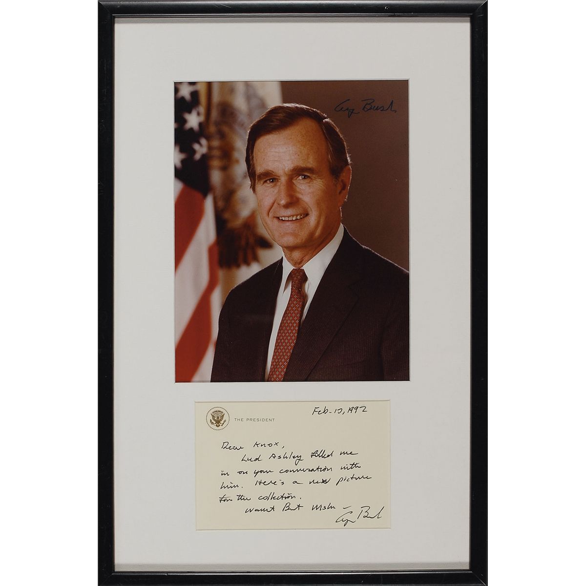 ALS as president, one page, 6 x 4, The President letterhead, February 10, 1992. Short letter to Knox McConnell. In full: “Lud Ashley filled me in on your conversation with him. Here’s a new picture for the collection.” Matted and framed with a color 8 x 10 photo of Bush, bearing an autopen signature, to an overall size of 12 x 18. In fine condition, with a small crease to right edge. Accompanied by the original mailing envelope.