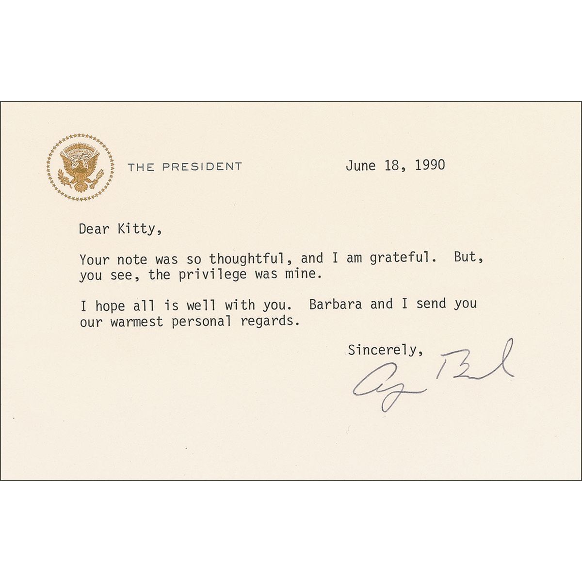TLS as president, one page, 6.25 x 4.25, gold-embossed White House ‘President’ letterhead, June 18, 1990. Bush writes to Esther Buhler “Kitty” Bradley, the widow of General Omar Bradley, in full: “Your note was so thoughtful, and I am grateful. But, you see, the privilege was mine. I hope all is well with you. Barbara and I send our personal regards.” In very fine condition. Accompanied by the original mailing envelope.