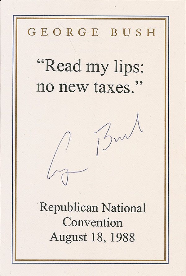 Ballpoint signature, “George Bush,” on a off-white 4 x 6 personal bookplate, to which was later added a quote from Bush’s speech at the 1988 Republican National Convention, “Read my lips: no new taxes.” Bookplate is affixed to a slightly larger off-white sheet. In fine condition.