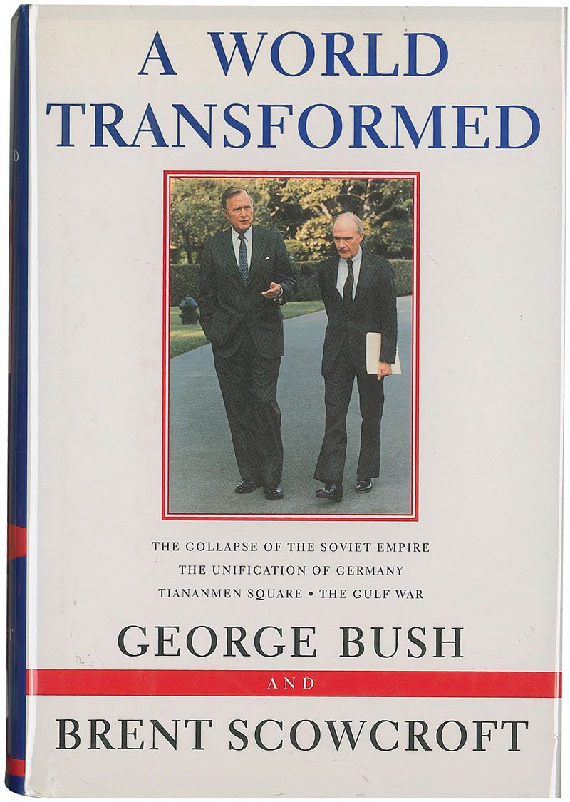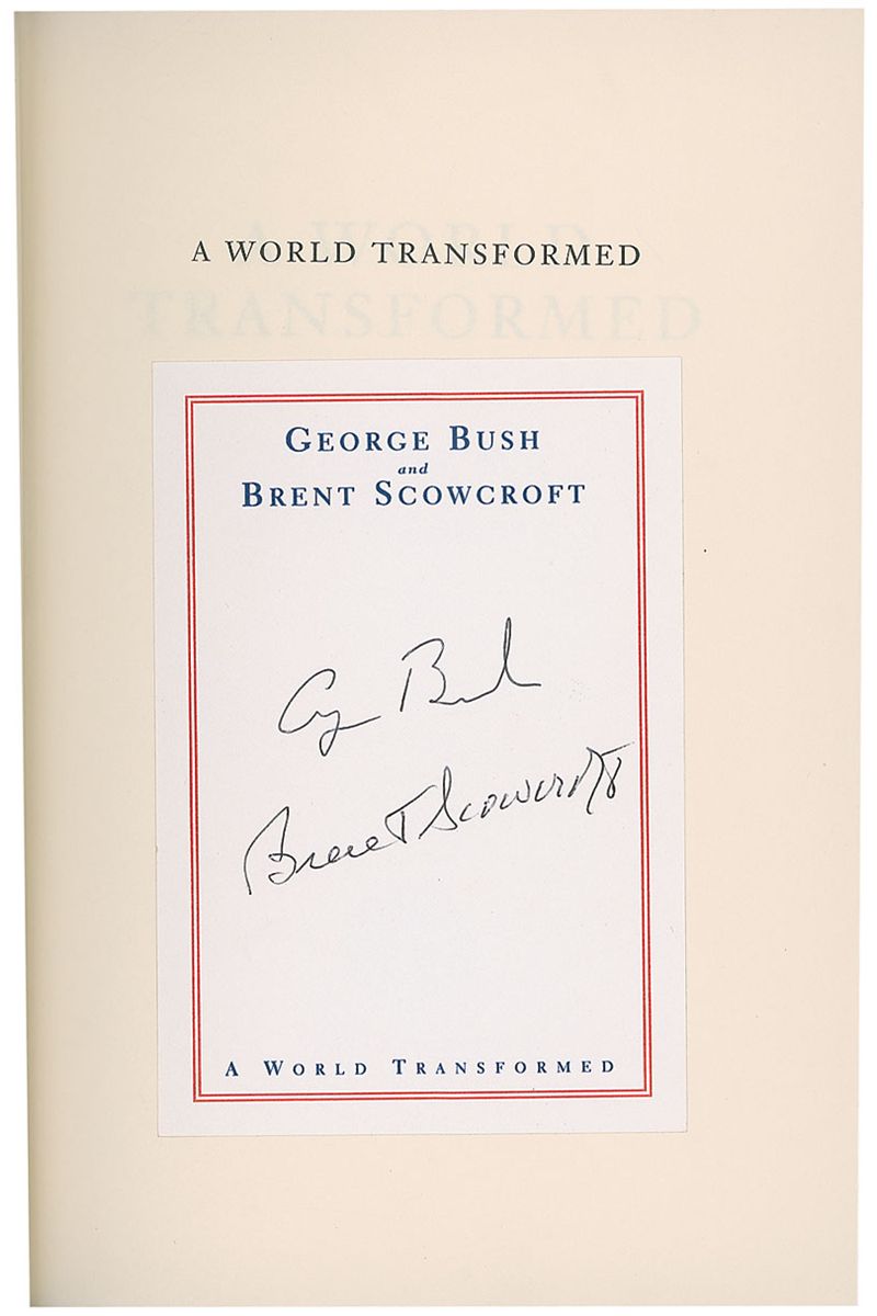 Signed book: A World Transformed. Later printing. NY: Alfred A. Knopf, 1998. Hardcover with dustjacket, 6.5 x 9.5, 590 pages. Signed on a bookplate affixed to the half-title page by George Bush and co-author Brent Scowcroft. In fine condition, with scattered light wear to dustjacket.