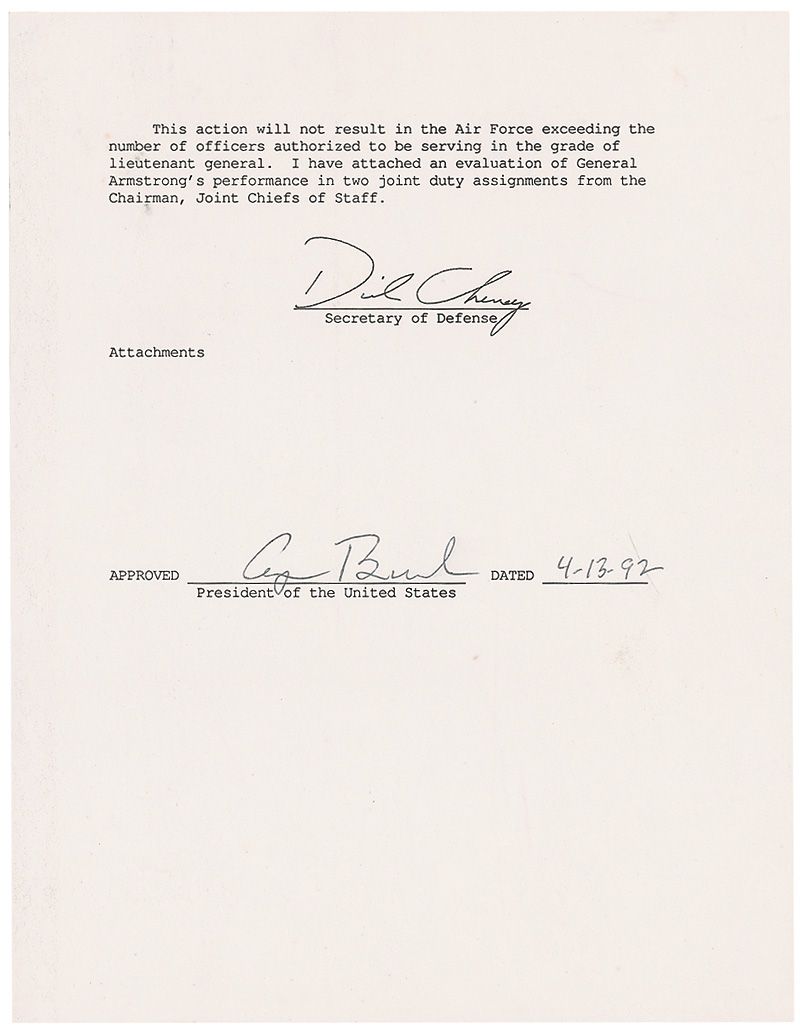 Partial DS as president, one page, 8.5 x 11, April 13, 1992. President Bush signs the last page of a document, which also bears a printed signature of Dick Cheney, stating, “This action will not result in the Air Force exceeding the number of officers authorized to be serving in the grade of lieutenant general. I have attached an evaluation of General Armstrong’s performance in two joint duty assignments from the Chairman, Joint Chiefs of Staff.” In fine condition.