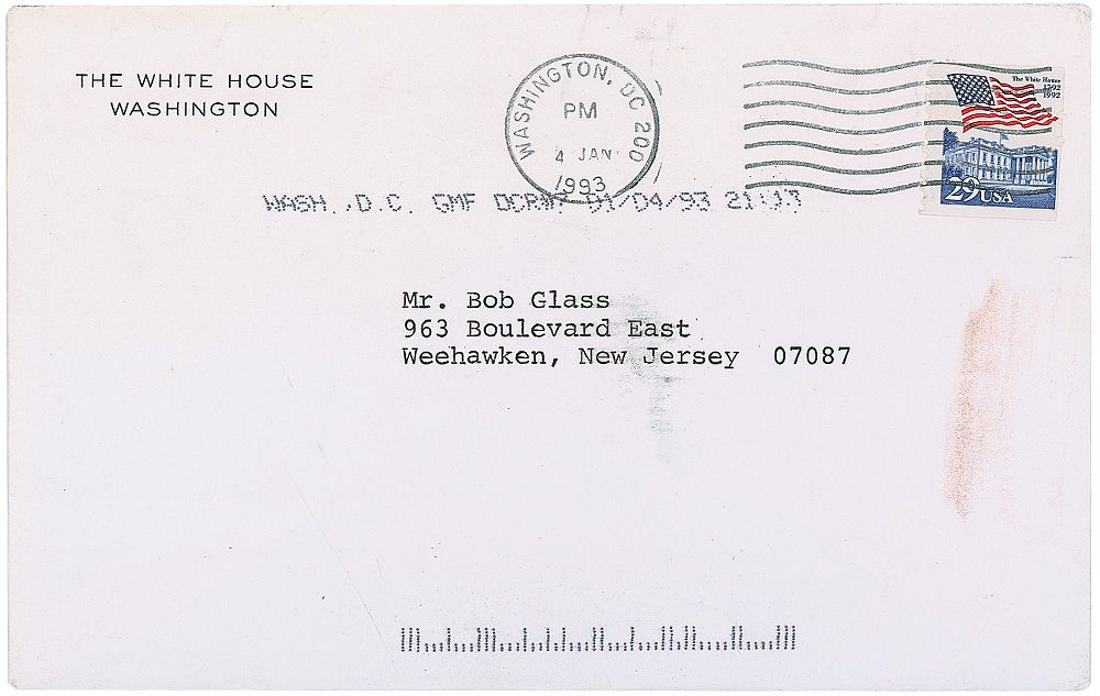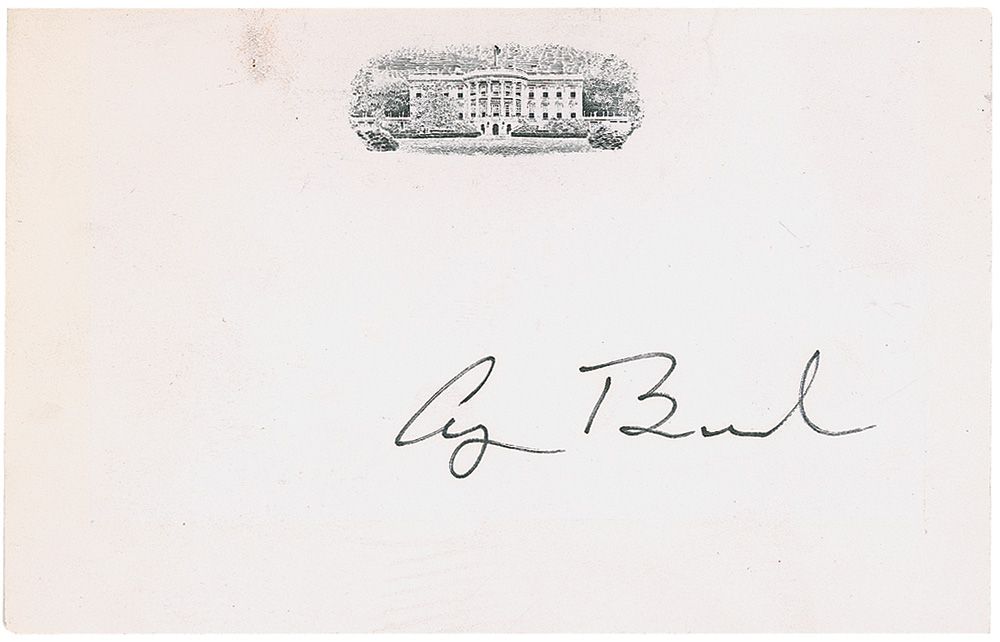 Felt tip signature, “George Bush,” on an off-white 6.5 x 4 card with a White House vignette at the top. Mild toning along left edge and some scattered light soiling near top, otherwise fine condition. Accompanied by the original White House mailing envelope.