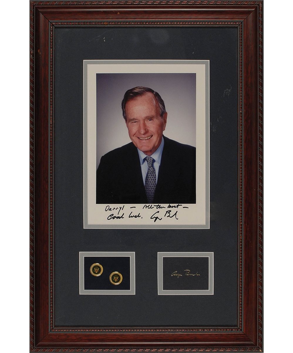 Color 7 x 9.5 cardstock photo of Bush, signed and inscribed in the lower border in black felt tip “Darryl—All the best—Good luck, George Bush.” Gorgeously double-matted and framed with a pair of presidential seal cufflinks and a gilt facsimile signature to an overall size of 14 x 21. In fine condition.