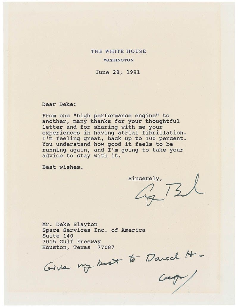 TLS as president, one page, 6.75 x 9, White House letterhead, June 28, 1991. Letter to Deke Slayton. In full: “From one ‘high performance engine’ to another, many thanks for your thoughtful letter and for sharing with me your experiences having atrial fibrillation. I’m feeling great, back up to 100 percent. You understand how good it feels to be running again, and I’m going to take your advice to stay with it.” Bush adds a brief handwritten postscript to the bottom, signing “George.” In fine condition, with a mild block of overall toning from previous display. On May 4, 1991, while jogging at Camp David, President Bush experienced shortness of breath and chest tightness. He was immediately rushed to the hospital where he was diagnosed with atrial fibrillation. This letter brings to light a common debilitating condition shared by the president and astronaut, and Slayton’s willingness to see Bush through this tough time after his diagnosis.