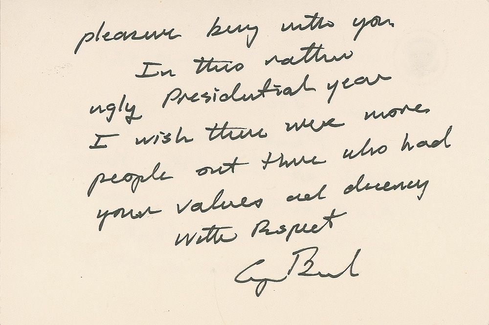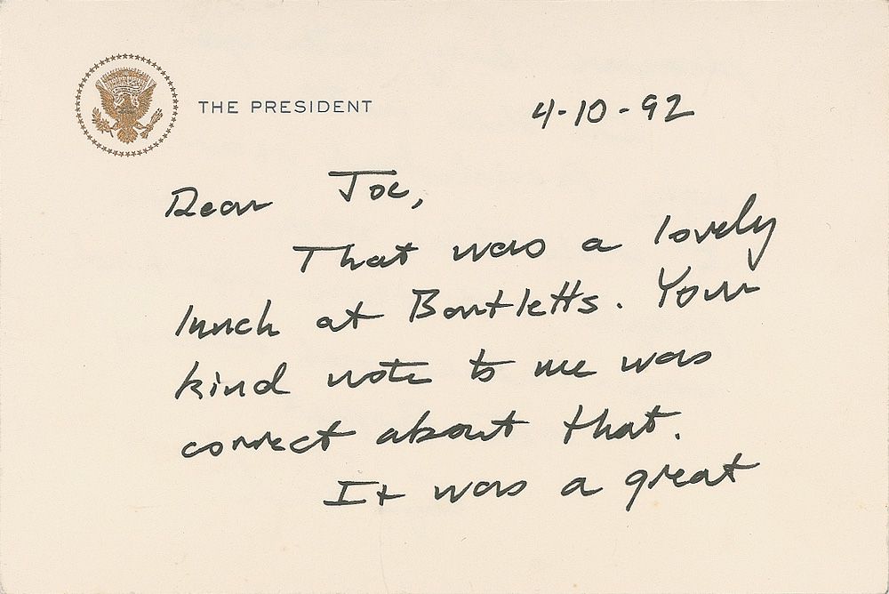 Scarce ALS as president, one page both sides, 6.25 x 4.25, embossed The President letterhead, April 10, 1992. Letter to Joseph Kingsbury-Smith. In full: “That was a lovely lunch at Bartletts. Your kind note to me was correct about that. It was a great pleasure being with you. In this rather ugly Presidential year I wish there were more people out there who had your values and decency.” In fine condition. In the midst of his re-election campaign, Bush rebuffed a New York Times article about the arrival of his son, George W. Bush, as a sign of ‘alarm’ on the day he sent this letter. Bush was defeated by Bill Clinton later that year.