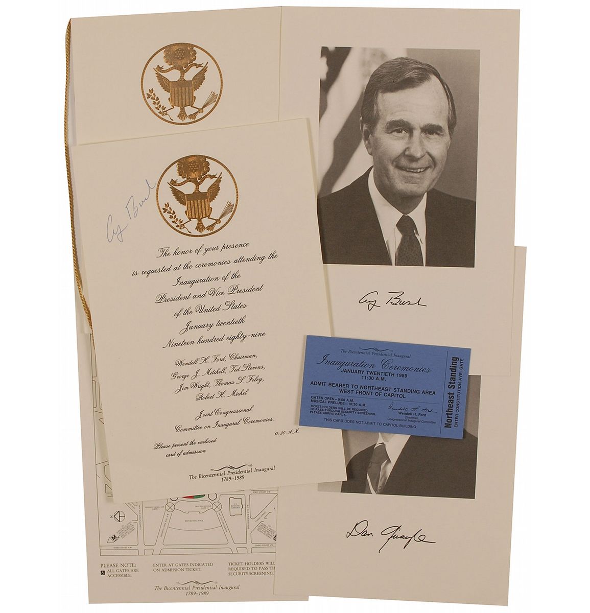 Invitation to Bush’s presidential inauguration, 6.5 x 10, signed at the top in blue ballpoint. In fine condition. Accompanied by the original ticket, inauguration program, photos of Bush and Quayle bearing pre-printed signatures, a map of the Capitol grounds, and the original envelope.