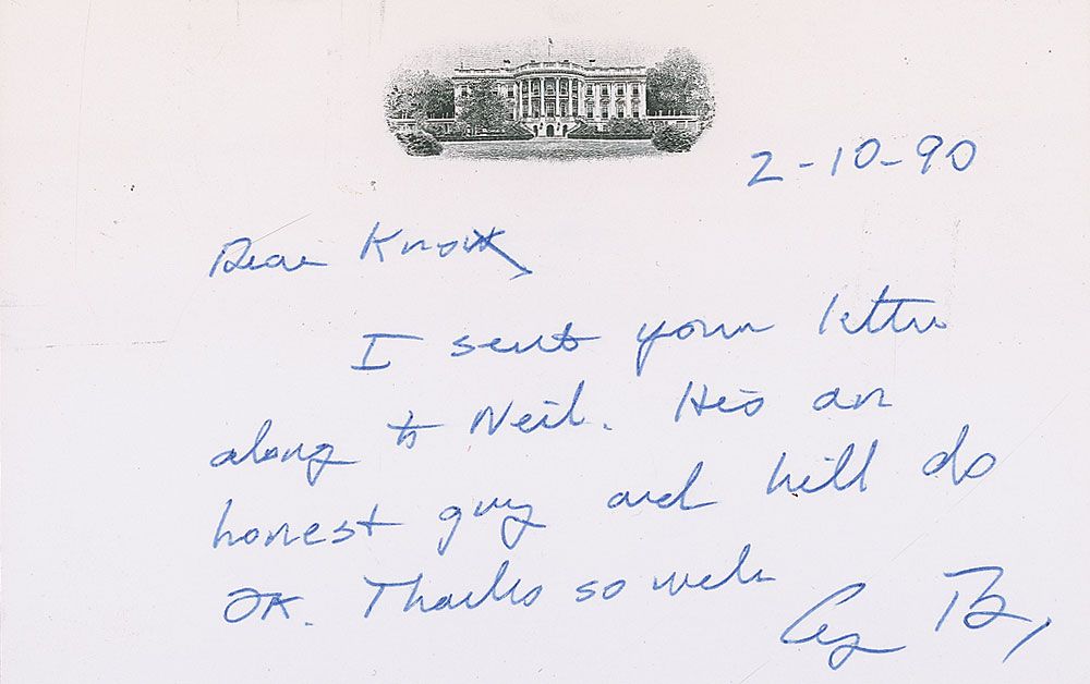 Uncommon ALS as president, one page, 6.5 x 4, engraved White House vignette letterhead, February 10, 1990. Letter to Knox reads, in full: “I sent your letter along to Neil. He’s an honest guy and will do OK. Thanks so much.” In very fine condition.