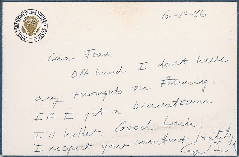 ALS, one page, 6.25 x 4, Vice President letterhead, June 14, 1986. Short letter to Joan Johnson. In full: “Off hand I don’t have any thoughts on financing. If I get a brainstorm I’ll holler. Good luck. I respect your commitment.” Letter and the original mailing envelope are affixed to a 7.5 x 9 board. In fine condition, with a light paperclip impression to top along with a small spot of toning.