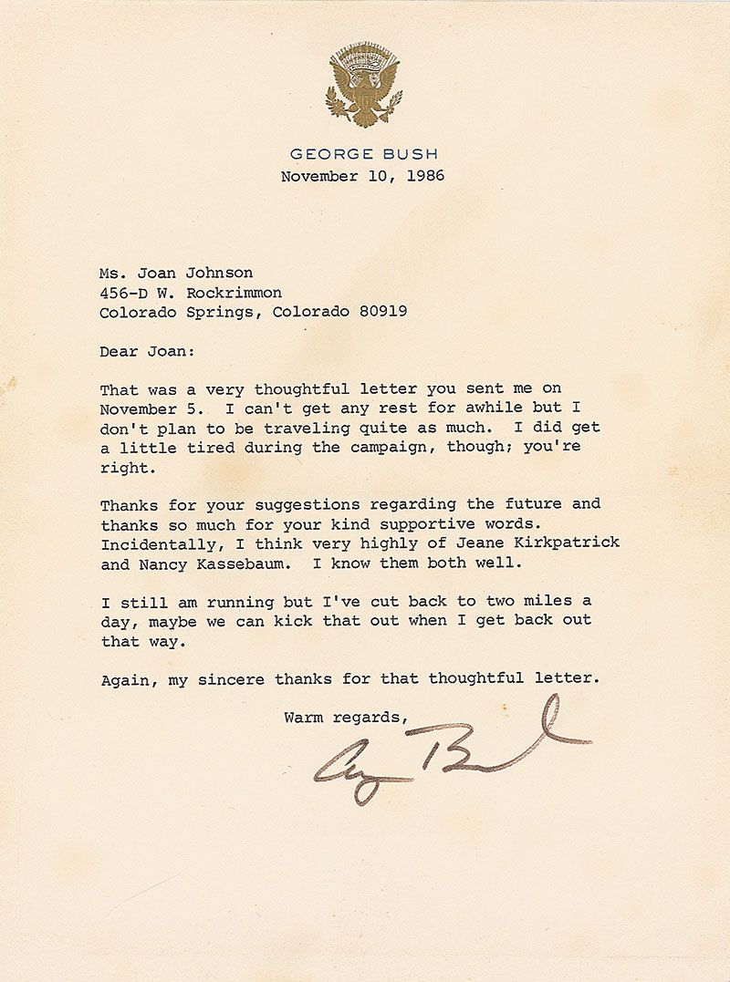 TLS, one page, 6.25 x 8.5, personal letterhead, November 10, 1986. Letter to Joan Johnson. In part: “I can’t get any rest for awhile but I don’t plan to be traveling quite as much. I did get a little tired during the campaign, though; you’re right. Thanks for your suggestions regarding the future and thanks so much for your kind supportive words. Incidentally, I think very highly of Jeane Kirkpatrick and Nancy Kassebaum.” In fine condition, with a few spots of light toning. Accompanied by the original mailing envelope.
