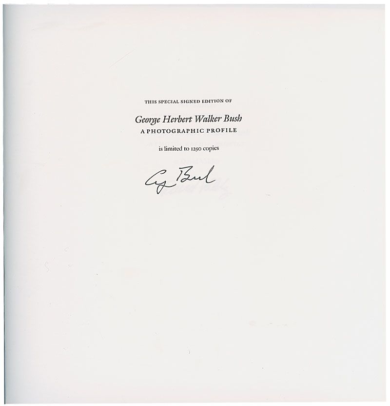 Signed book: George Herbert Walker Bush: A Photographic Profile. Limited edition of 1250 copies. College Station: Texas A & M University Press, 1997. Hardcover with slipcase, 11.25 x 11.25, 147 pages. Signed on the colophon in black ink by Bush, and also signed on another opening page by photographer David Valdez. In fine condition, with some light haloing to Valdez’s signature and some light rubbing to slipcase.