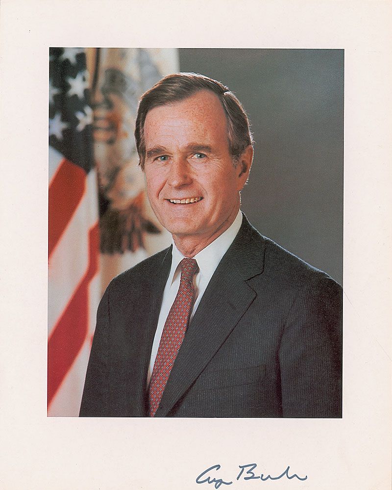 Color 8 x 10 cardstock photo of Bush in front of an American flag, signed in the lower border in black felt tip. In fine condition.