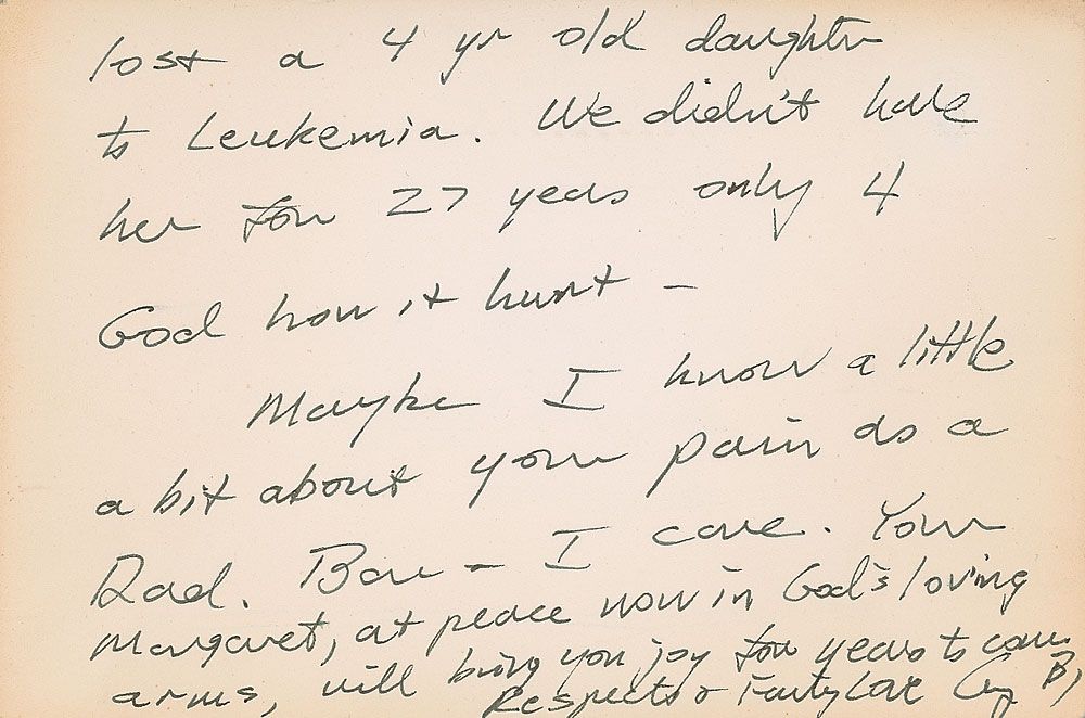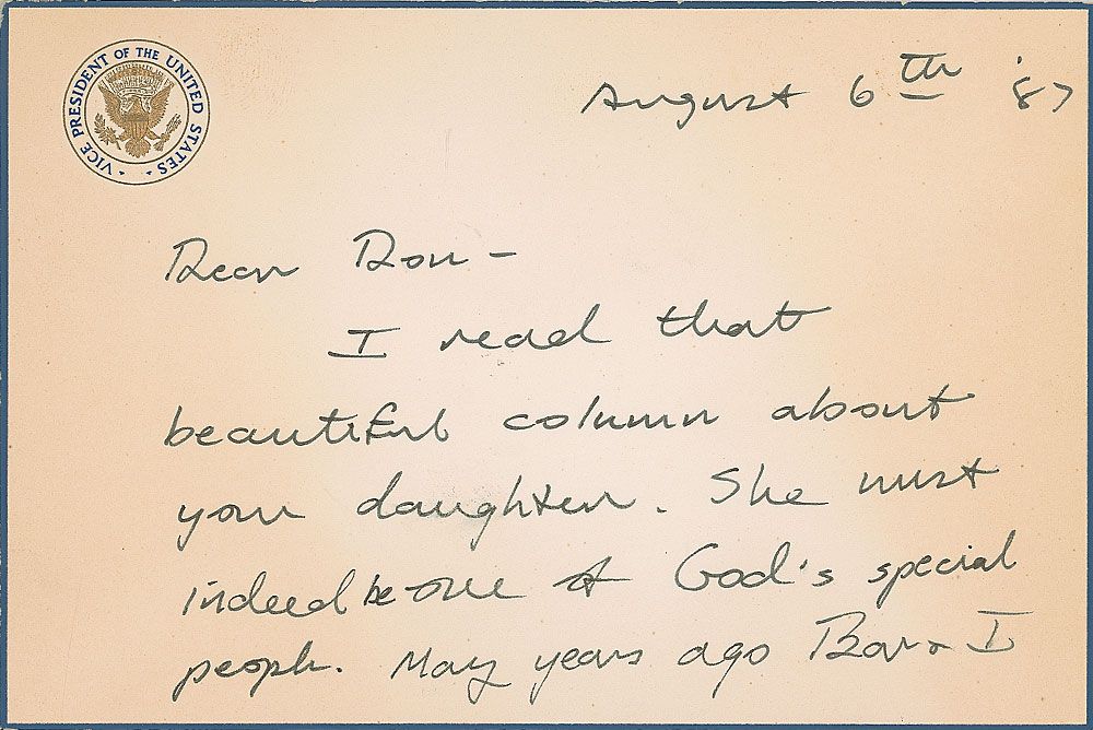 ALS signed “George B,” one page both sides, 6.25 x 4.25, Vice President letterhead, August 6, 1987. In part: “I read that beautiful column about your daughter. She must indeed be one of God’s special people. Many years ago Bar & I lost a 4 yr old daughter to Leukemia. We didn’t have her for 27 years only 4 God how it hurt.” In very good condition, with moderate toning, a bit heavier to the front.