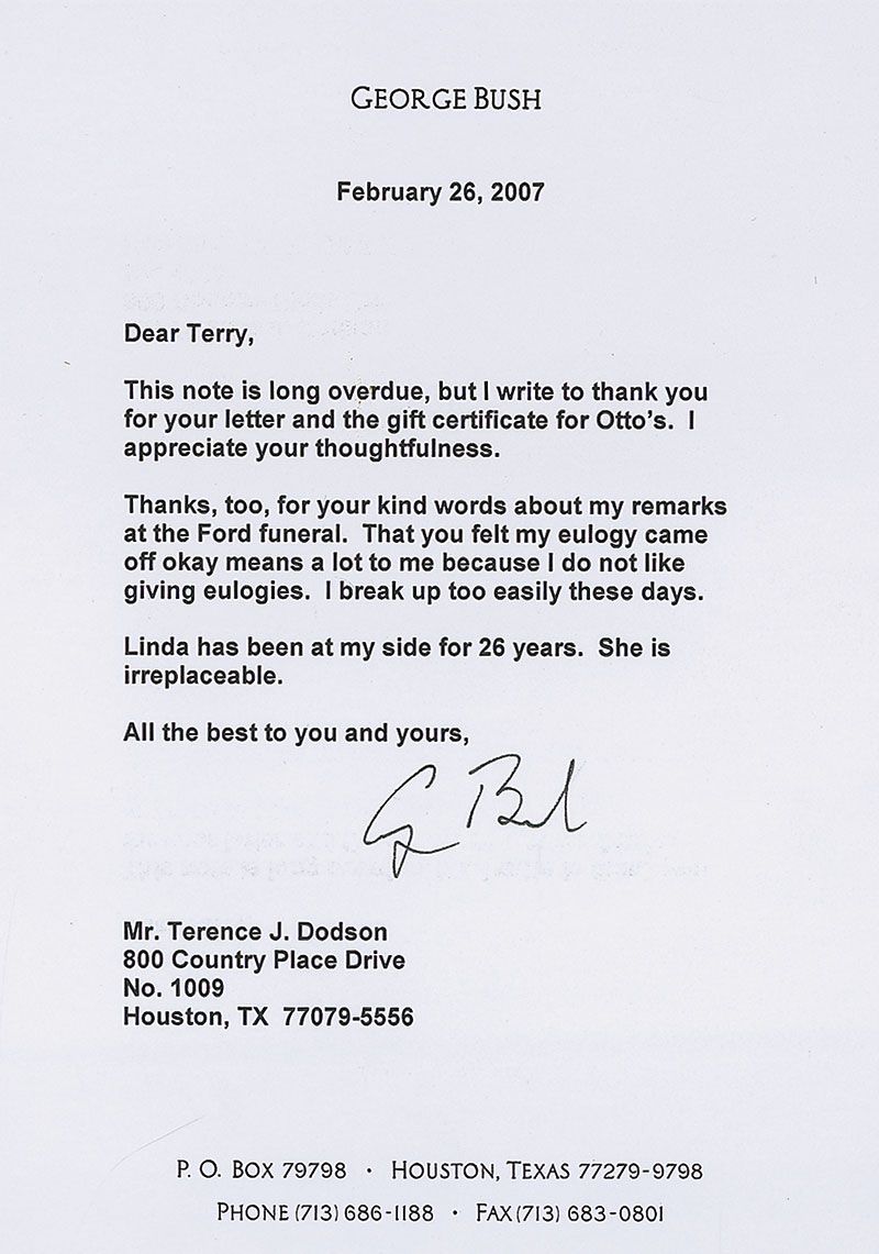 TLS, one page, 6 x 8.5, personal letterhead, February 26, 2007. Letter of thanks for a gift. In part: “Thanks, too, for your kind words about my remarks at the Ford funeral. That you felt my eulogy came off ok means a lot to me because I do not like giving eulogies. I break up too easily these days.” In fine condition. Accompanied by the original mailing envelope.