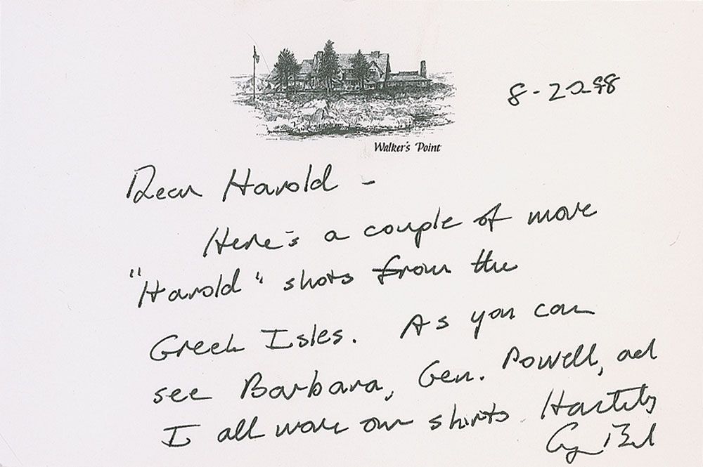 ALS signed “Hastily, George Bush,” one page, 6.25 x 3.25, Walker’s Point letterhead, August 20, 1998. Brief letter to Harold Wiesenthal. In full: “Here’s a couple of more ‘Harold’ shots from the Greek Isles. As you can see, Barbara, Gen. Powell, and I all wore our shirts.” In very fine condition.