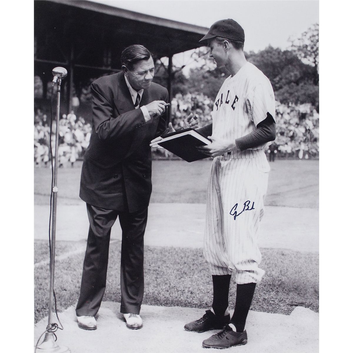 Satin-finish 16 x 20 photo of a young Bush in his Yale baseball uniform meeting Babe Ruth prior to a game, signed in black felt tip. In 1948, during the home game against Princeton University, Bush got a chance to meet one of his baseball heroes, Babe Ruth. In one of his last public appearances before his death that year, Babe Ruth presented Bush, then the team captain, with the manuscript of his autobiography, which he was donating to Yale. Photo was signed at a private signing in Kennebunkport, Maine, on May 29, 2008.