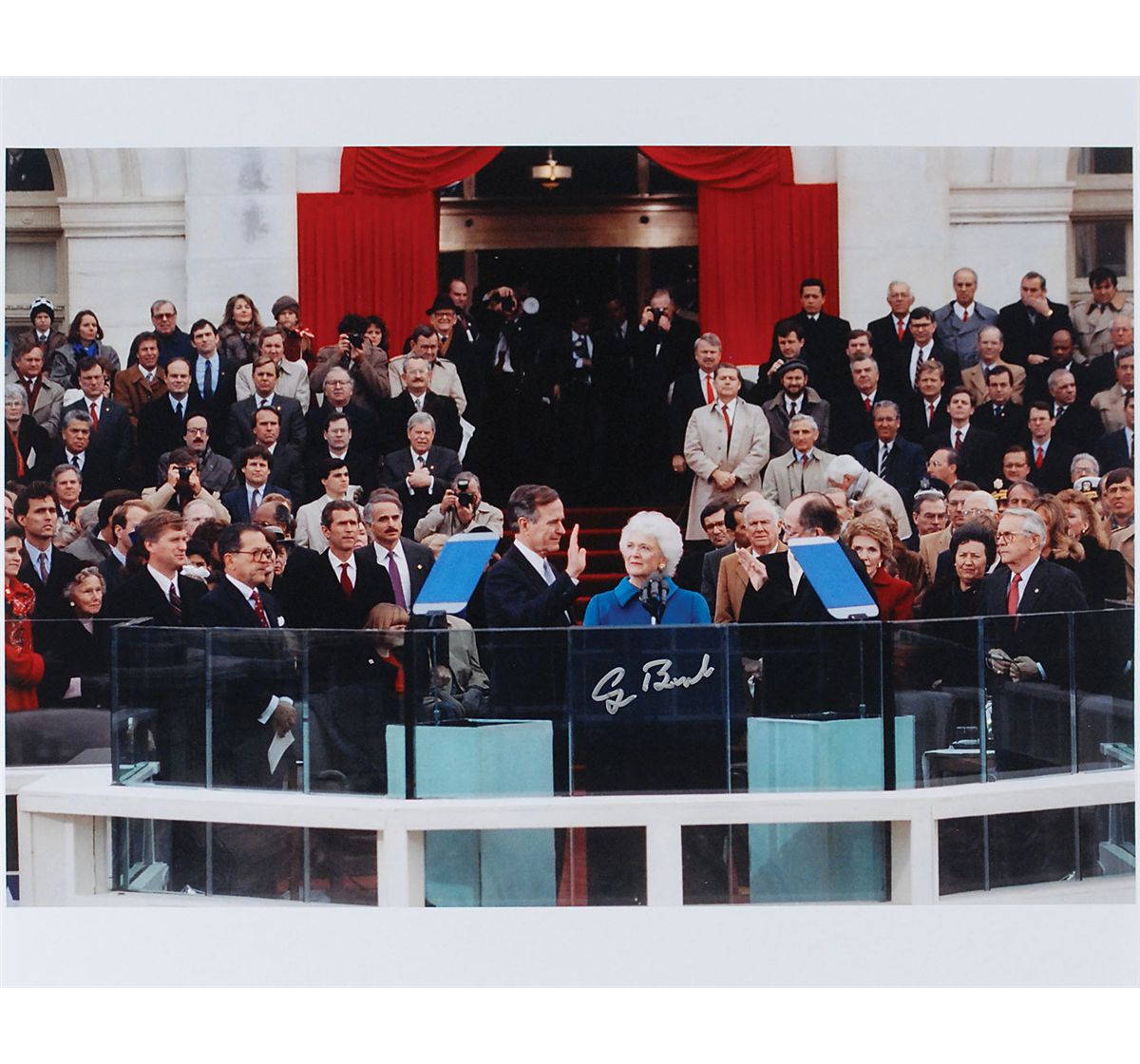 Color satin-finish 20 x 16 photo of Bush taking the Oath of Office on the steps of the Capitol, signed in silver ink. In very fine condition.