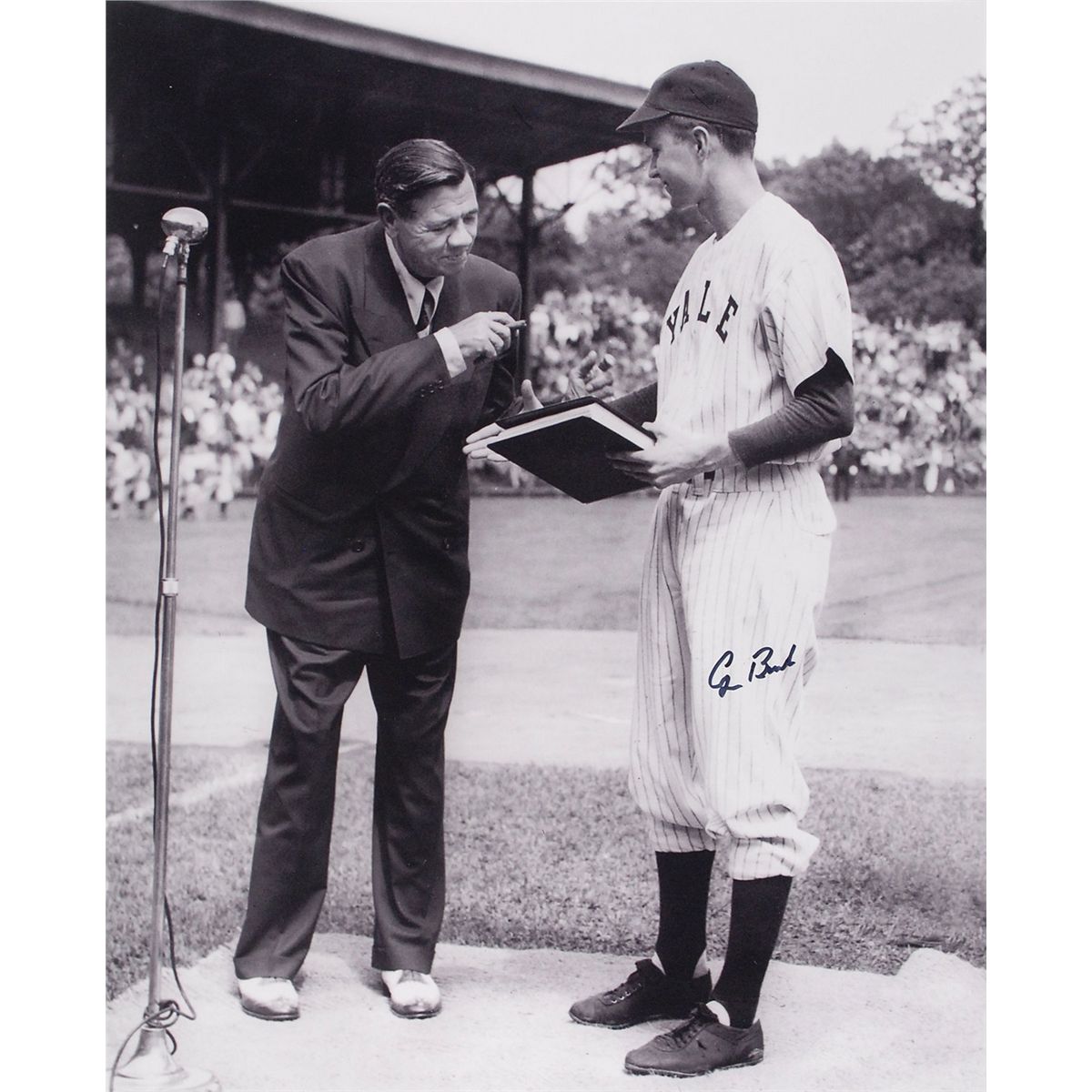 Satin-finish 16 x 20 photo of a young Bush in his Yale baseball uniform meeting Babe Ruth prior to a game, signed in black felt tip. In 1948, during the home game against Princeton University, Bush got a chance to meet one of his baseball heroes, Babe Ruth. In one of his last public appearances before his death that year, Babe Ruth presented Bush, then the team captain, with the manuscript of his autobiography, which he was donating to Yale. Photo was signed at a private signing in Kennebunkport, Maine, on May 29, 2008.