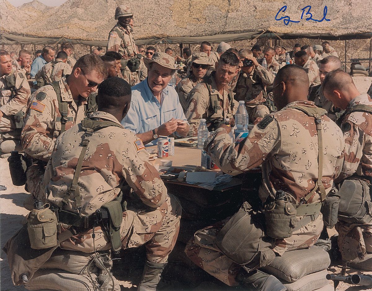 Color glossy 14 x 11 photo of Bush dining with the troops during Desert Storm, signed in blue felt tip. In fine condition.