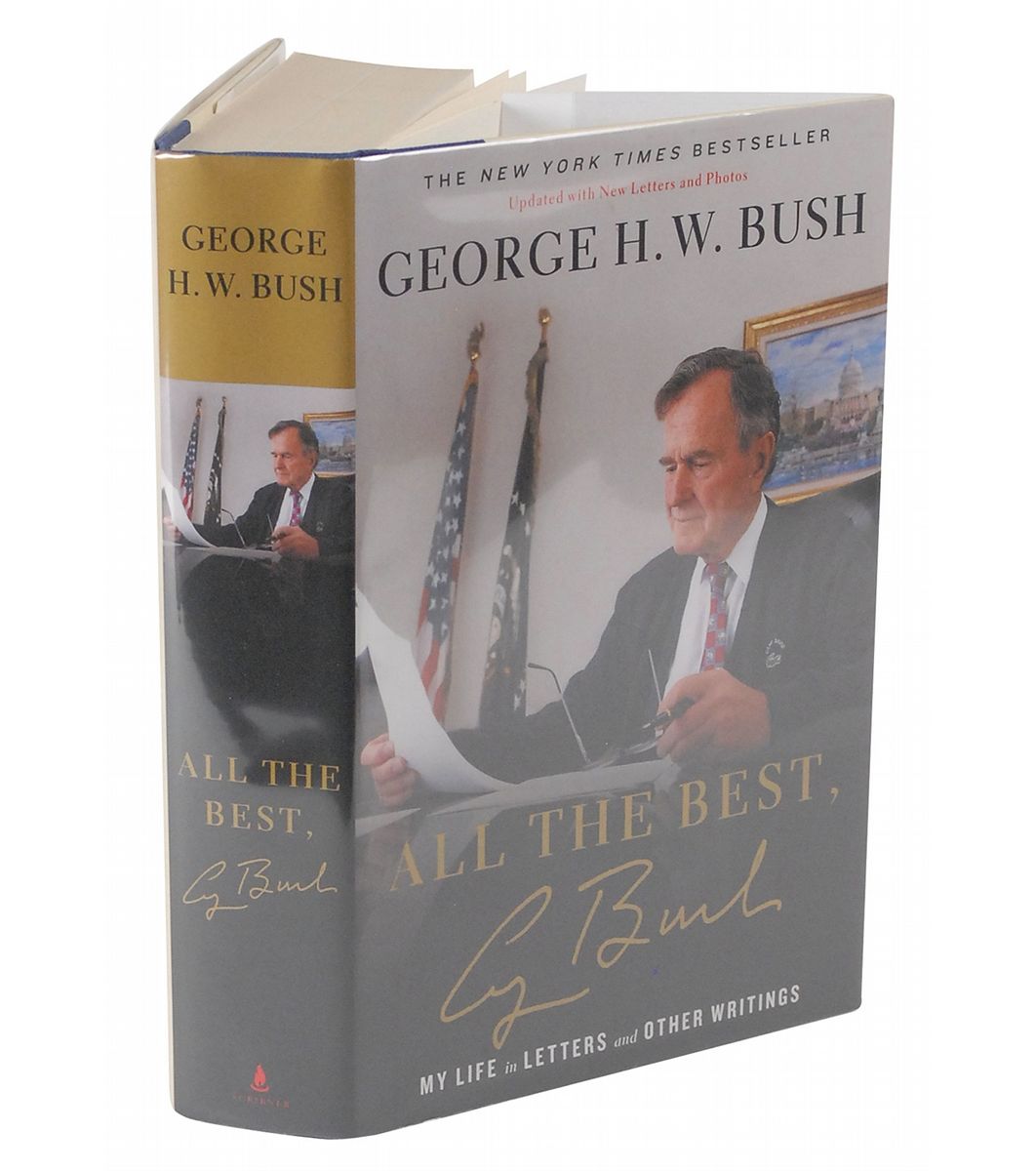 Signed book: All the Best, George Bush. First edition, first printing. NY: Scribner, 2013. Hardcover with dust jacket, 6.5 x 9.5, 717 pages. Signed in black felt tip on a bookplate affixed to the half-title page, with an inscription in another hand to former Virginia senator Harry Byrd, “To Harry Byrd, All the best.” In very fine condition.
