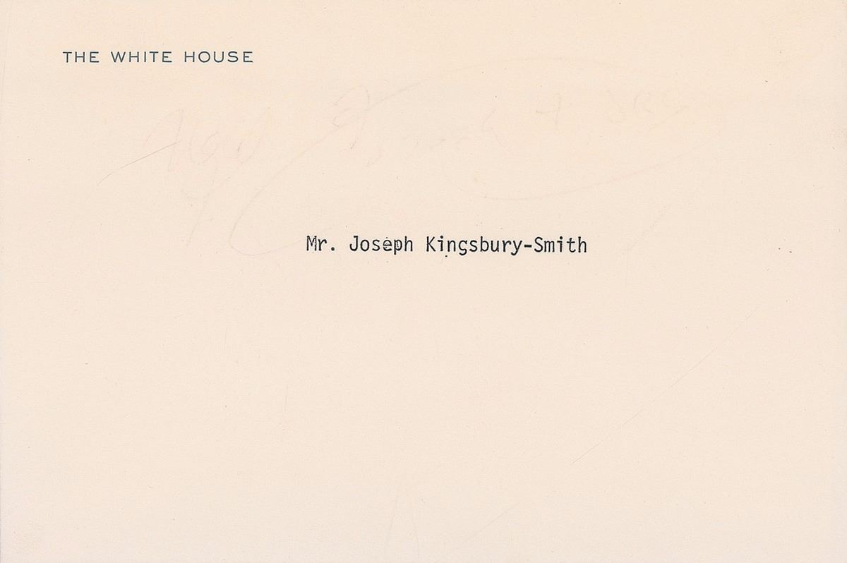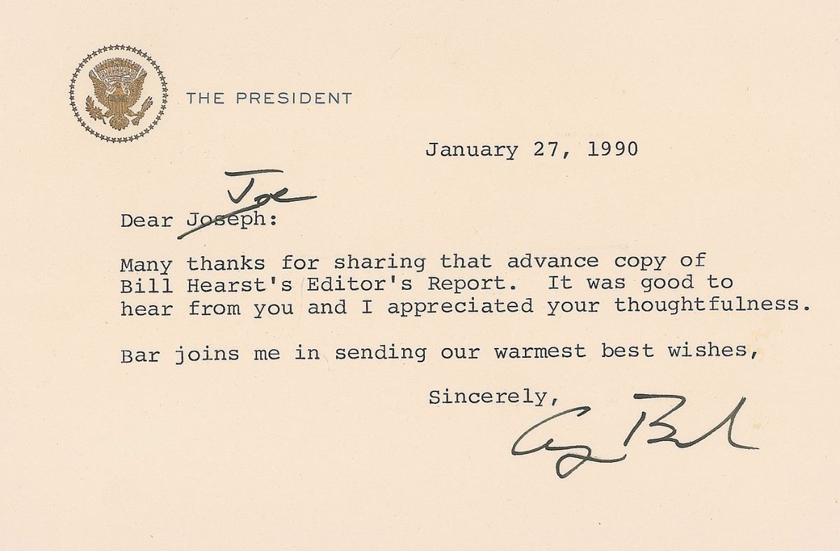 TLS as president, one page, 6.25 x 4.25, presidential letterhead, January 27, 1968. Short letter to Joseph Kingsbury-Smith, who Bush addresses as “Joe.” In part: “Many thanks for sharing that advance copy of Bill Hearst’s Editor’s Report. It was good to hear from you.” In fine condition. Accompanied by the original White House transmittal envelope. Kingsbury-Smith was a national editor and chief foreign writer of Hearst Newspapers.