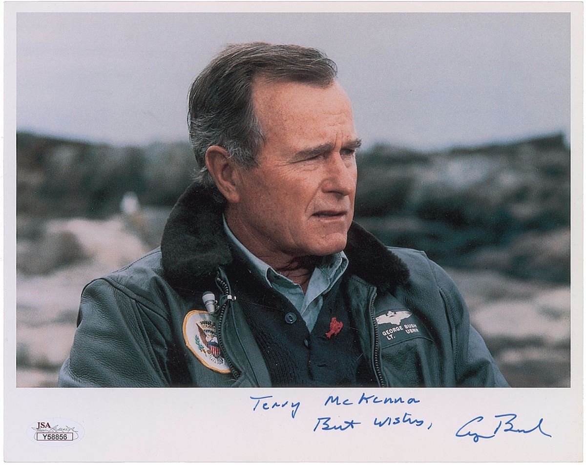 Color semi-glossy 10 x 8 cardstock photo of President Bush wearing a United States Naval Reserve coat, signed and inscribed in the lower border in blue felt tip, “Terry McKenna, Best wishes, George Bush.” In fine condition, with a trivial crease and a JSA label affixed to lower left corner. Accompanied by a full letter of authenticity from JSA.