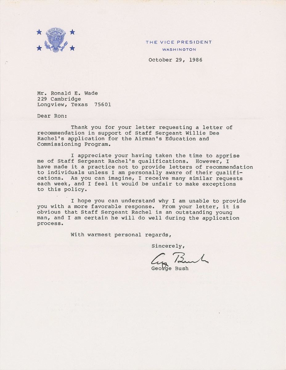 TLS as vice president, one page, 8.5 x 11, Vice President letterhead, October 29, 1986. Letter to Ronald E. Wade, in part: “I appreciate your having taken the time to apprise me of Staff Sergeant Rachel’s qualifications. However, I have made it a practice not to provide letters of recommendation to individuals unless I am personally aware of their qualifications. As you can imagine, I receive many similar requests each week, and I feel it would be unfair to make exceptions to this policy. I hope you can understand why I am unable to provide you with a more favorable response.” In fine condition.