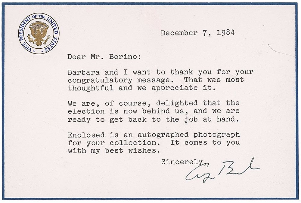 TLS as vice president, one page, 6.5 x 4.25, Vice President of the United States blue-bordered cardstock stationery, December 7, 1984. Letter to an admirer, in part: “We are, of course, delighted that the election is now behind us, and we are ready to get back to the job at hand.” In fine condition, with a stray pencil mark.