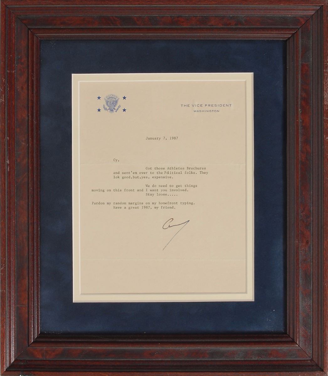 TLS as vice president signed “George,” one page, 6.5 x 8.25, The Vice President letterhead, January 7, 1987. Letter to Cy, in full: “Got those Athletes Brochures and sent ’em over to the Political folks. They lo[o]k good, but, yes, expensive. We do need to get things moving on this front and I want you involved. Stay loose….Pardon my random margins on my homefront typing. Have a great 1987, my friend.” In fine condition.