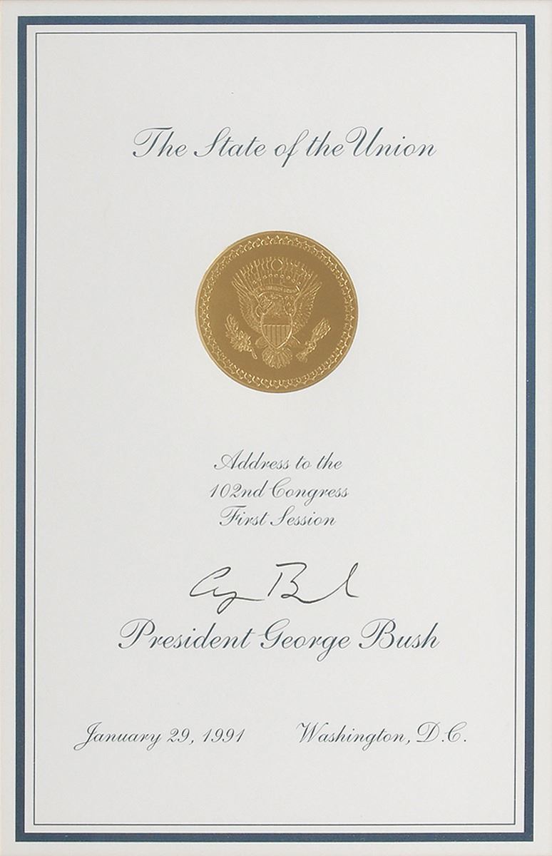 Booklet cover for Bush’s third State of the Union Address, given on January 29, 1991, 6.5 x 10.25, boldly signed below the gold presidential seal in black felt tip. Nicely double-matted and framed to an overall size of 12.5 x 16.5. In fine condition.