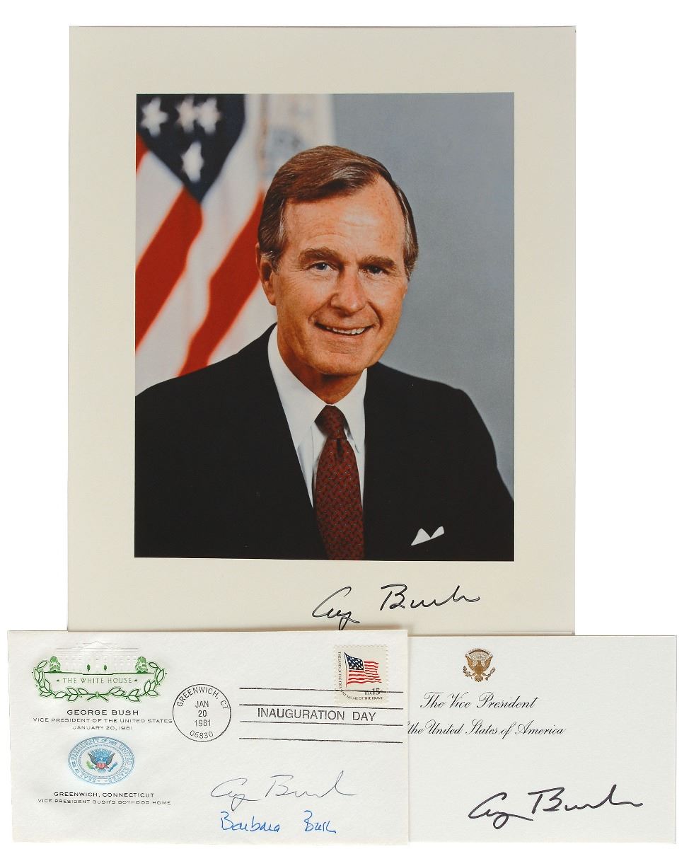 Collection of three items, including: a 1981 Inauguration Day commemorative cover, signed in ink by George Bush and Barbara Bush; a vice president card, signed in black felt tip by Bush; and a color satin-finish 8 x 10 photo, signed in black felt tip by Bush. In overall fine condition. Accompanied by two transmittal letters from the vice president’s office and an original mailing envelope.