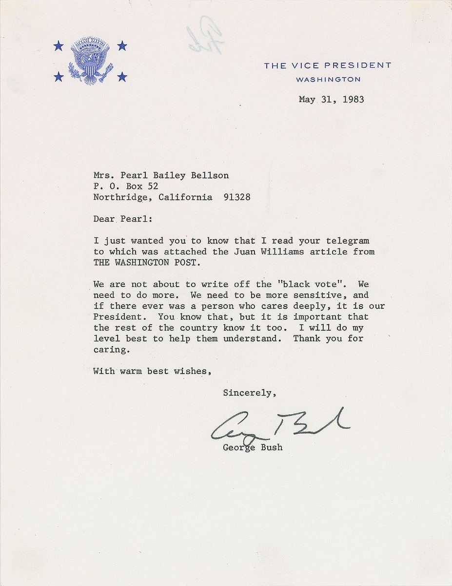 TLS, one page, 7 x 9, The Vice President letterhead, May 31, 1983. Letter to actress/singer Pearl Bailey Bellson, in full: “I just wanted you to know that I read your telegram to which was attached the Juan Williams article from The Washington Post. We are not about to write off the ‘black vote.’ We need to do more. We need to be more sensitive, and if there ever was a person who cares deeply, it is our President. You know that, but it is important that the rest of the country know it too. I will do my level best to help them understand. Thank you for caring.” In fine condition.