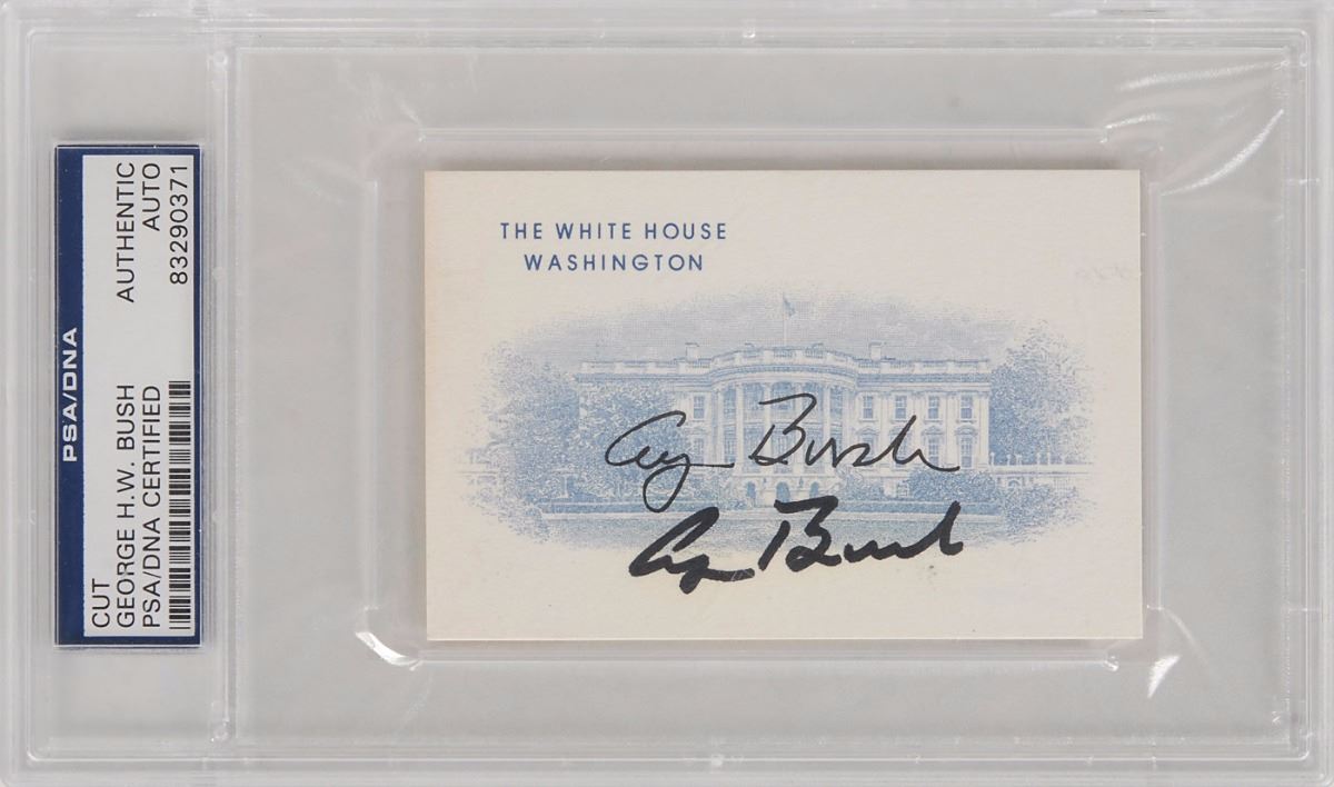 White House card, 3.75 x 2.5, with a vignette of the White House, signed in black ink by Bush above a facsimile signature. Encapsulated in a plastic PSA/DNA authentication holder. In fine condition.