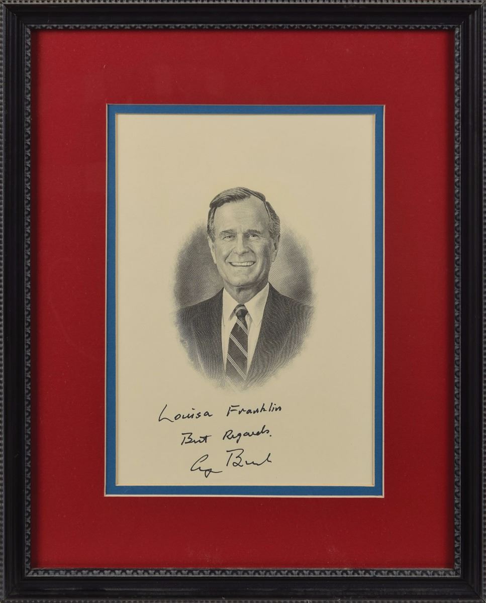 Official engraving of President Bush, 6.5 x 9.5, signed and inscribed in black felt tip, "Louisa Franklin, Best Regards, George Bush." Double-matted and framed to an overall size of 12 x 15. In fine condition.