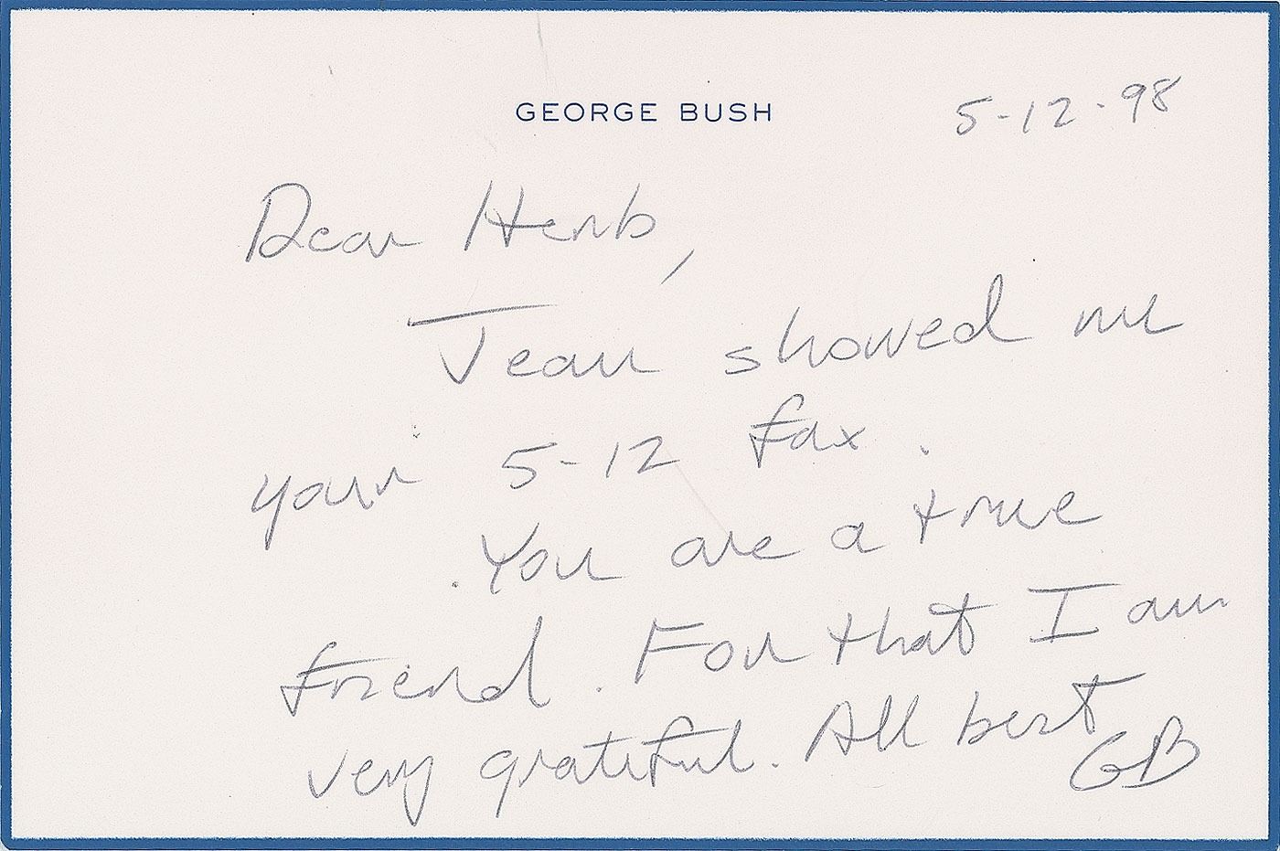 ALS signed “GB,” one page, 6.25 x 4.25, personal letterhead, May 12, 1998. Letter to his biographer Herbert Parmet, in full: "Jean showed me your 5-12 fax. You are a true friend. For that I am very grateful." In very fine condition. Accompanied by the original mailing envelope.