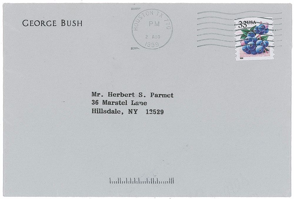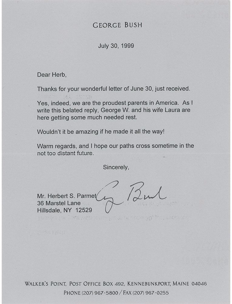 TLS, one page, 6.25 x 8.5, personal letterhead, July 30, 1999. Letter to his biographer Herbert Parmet, in part: "Yes, indeed, we are the proudest parents in America. As I write this belated reply, George W. and his wife Laura are here getting some much needed rest. Wouldn't it be amazing if he made it all the way! Warm regards, and I hope our paths cross sometime in the not too distant future." In fine condition. Accompanied by the original mailing envelope. Then governor of Texas, George W. Bush announced his candidacy for the Republican presidential nomination on June 12, 1999. After winning the primaries, he received the nomination at the Republican National Convention on August 3, 2000, and went on to win a controversial election against Al Gore in November.