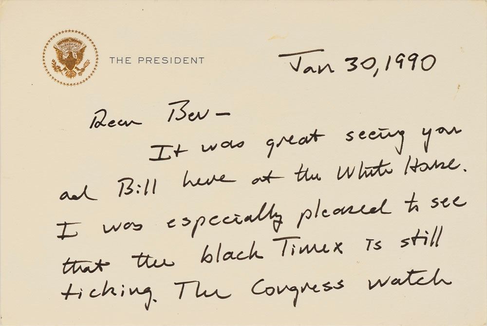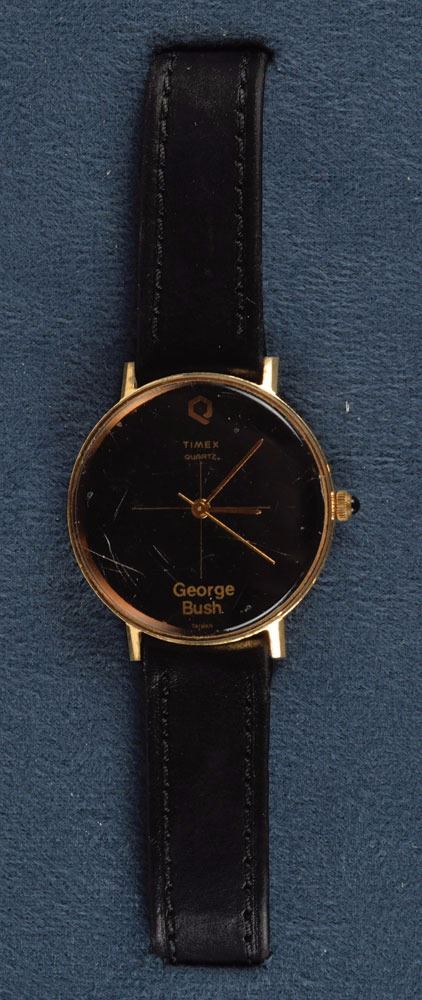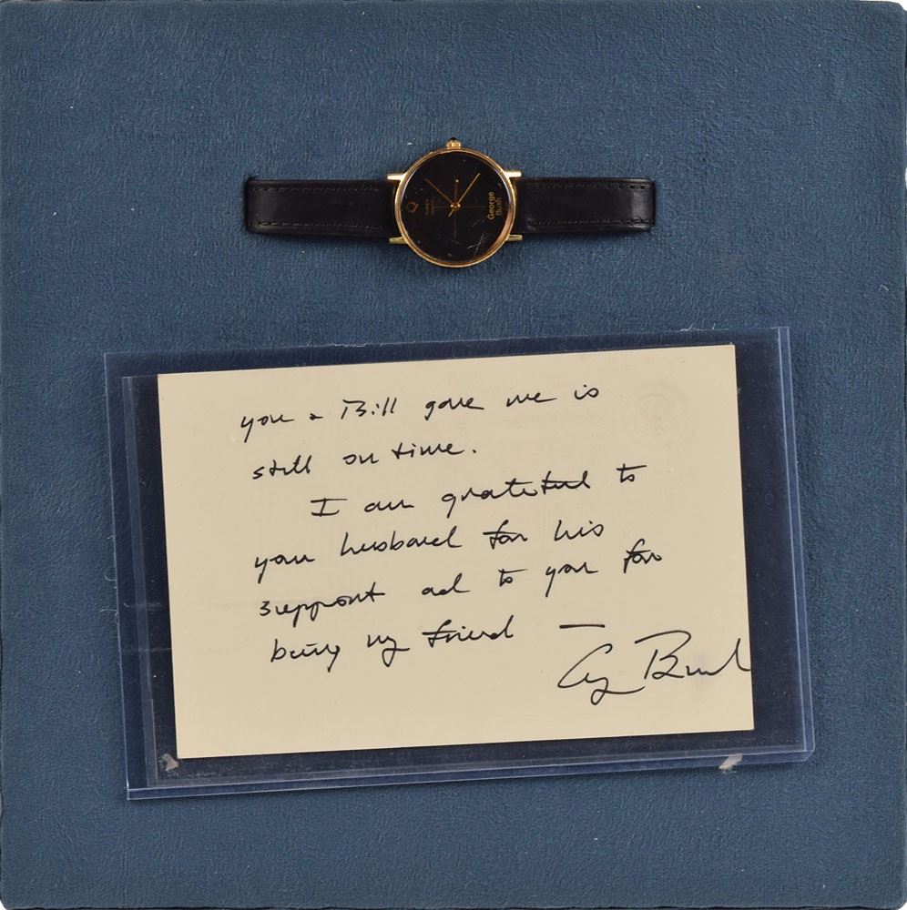 Two items, comprising an ALS as president and a "George Bush" Timex wristwatch. First is an ALS as president, one page both sides, 6.25 x 4.25, January 30, 1990, to Beverly Young, the wife of Congressman Bill Young, in full: "It was great seeing you and Bill here at the White House. I was especially pleased to see that the black Timex is still ticking. The Congress watch you & Bill gave to me is still on time. I am grateful to your husband for his support and to you for being my friend." The letter is displayed in a sleeve attached to a cloth-covered 10 x 10 board which displays the black Timex quartz wristwatch given to Young by Bush, which has "George Bush" in gold lettering at the six o'clock position. In overall fine condition, with some scuffs to the watch's crystal. Accompanied by a full letter of authenticity from PSA/DNA for the autograph letter. Republican Congressman Bill Young represented Florida in the House of Representatives from 1971 until his death in 2013.