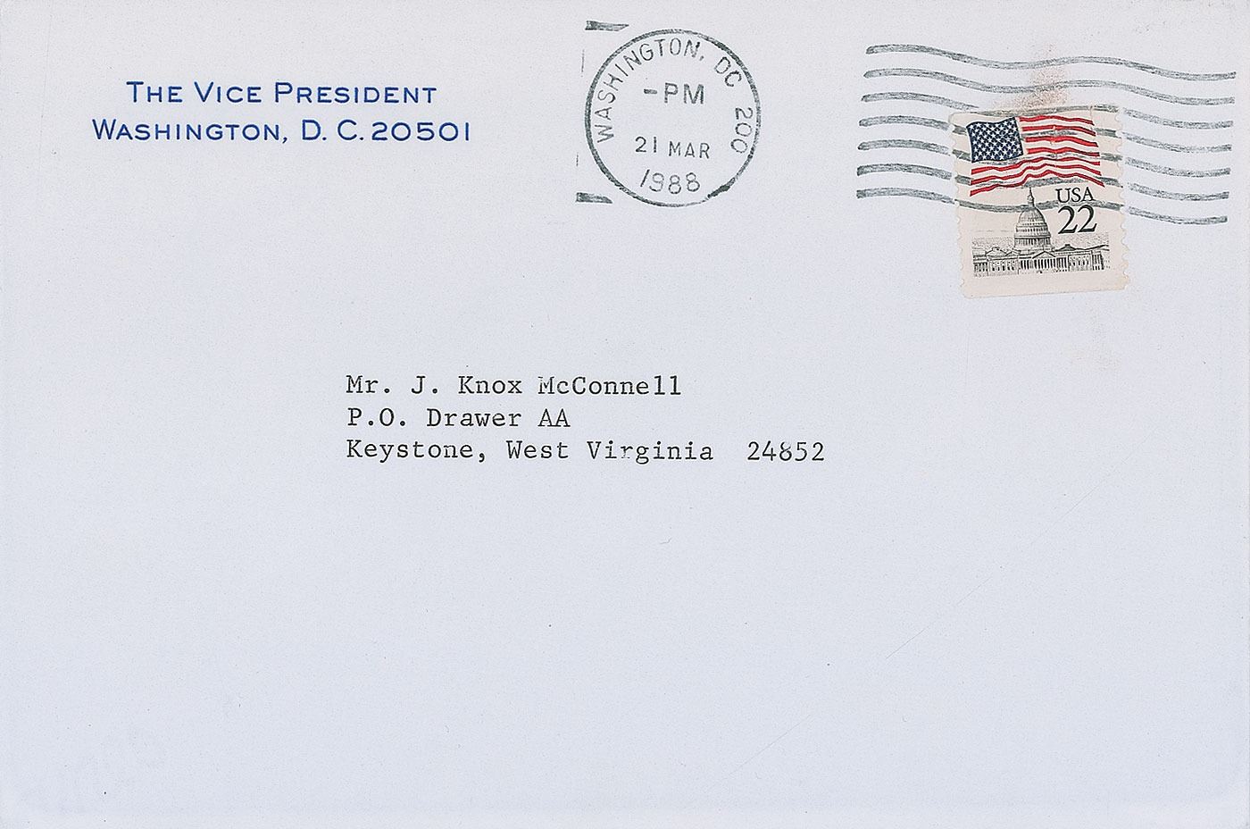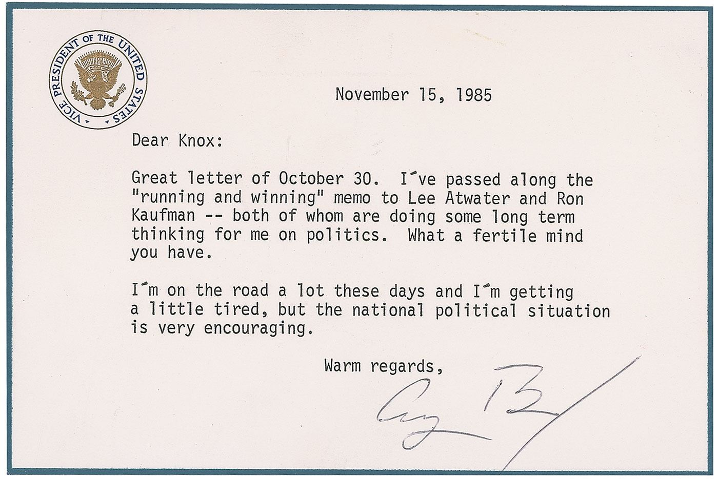 TLS as vice president, signed “George Bush,” on an embossed 6.25 x 4.25 vice presidential card, November 15, 1985. Letter to J. Knox McConnell, in full: “Great letter of October 30. I’ve passed along the ‘running and winning’ memo to Lee Atwater and Ron Kaufman—both of whom are doing some long term thinking for me on politics. What a fertile mind you have. I’m on the road a lot these days and I’m getting a little tired, but the national political situation is very encouraging.” In fine condition. Accompanied by the original mailing envelope.