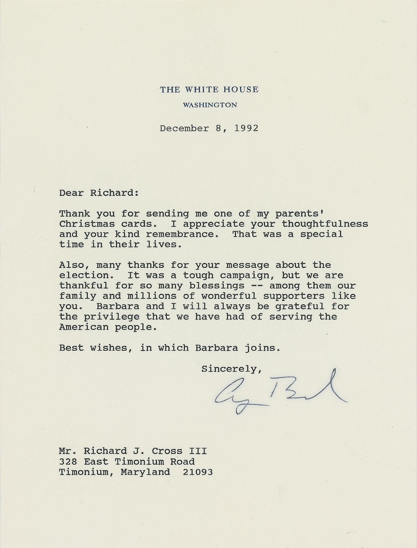 TLS as president, one page, 6.75 x 8.75, White House letterhead, December 8, 1992. Letter to Richard J. Cross III, in full: "Thank you for sending me one of my parents' Christmas cards. I appreciate your thoughtfulness and your kind remembrance. That was a special time in their lives. Also, many thanks for your message about the election. It was a tough campaign, but we are thankful for so many blessings—among them our family and millions of wonderful supporters like you. Barbara and I will always be grateful for the privilege that we have had of serving the American people. Best wishes, in which Barbara joins." In very fine condition.