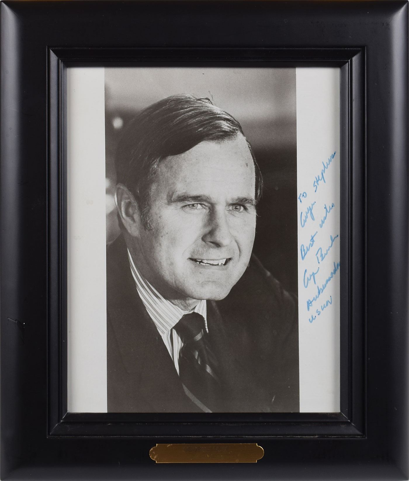 Glossy 7.5 x 9.5 photo of Bush as ambassador to the United Nations, signed and inscribed in the right border in black felt tip, "To George Stephens, Best wishes, George Bush, Ambassador, US UN.” Framed to an overall size of 11 x 13. In fine condition.