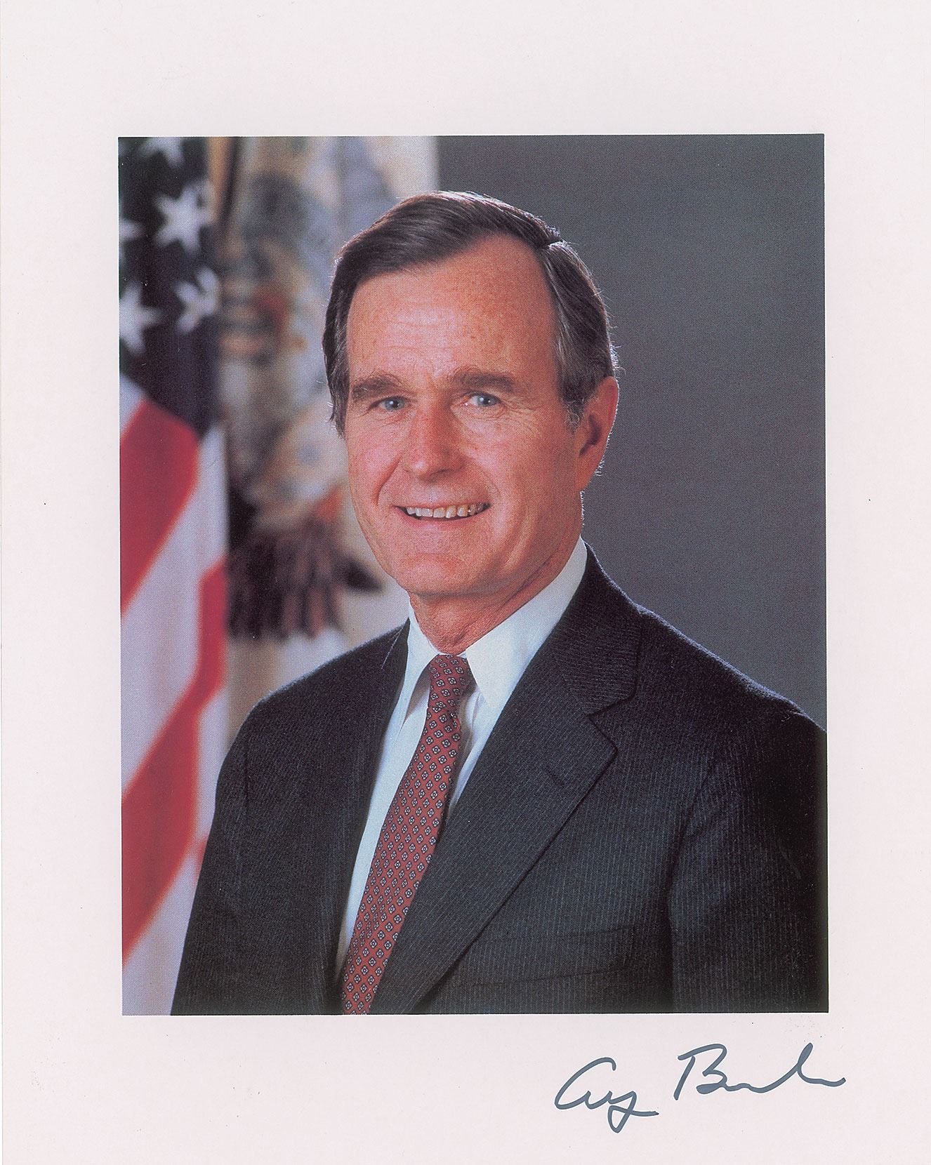 Color 8 x 10 cardstock photo of Bush in a suit and tie, signed in the wide lower margin in black felt tip. In fine condition.