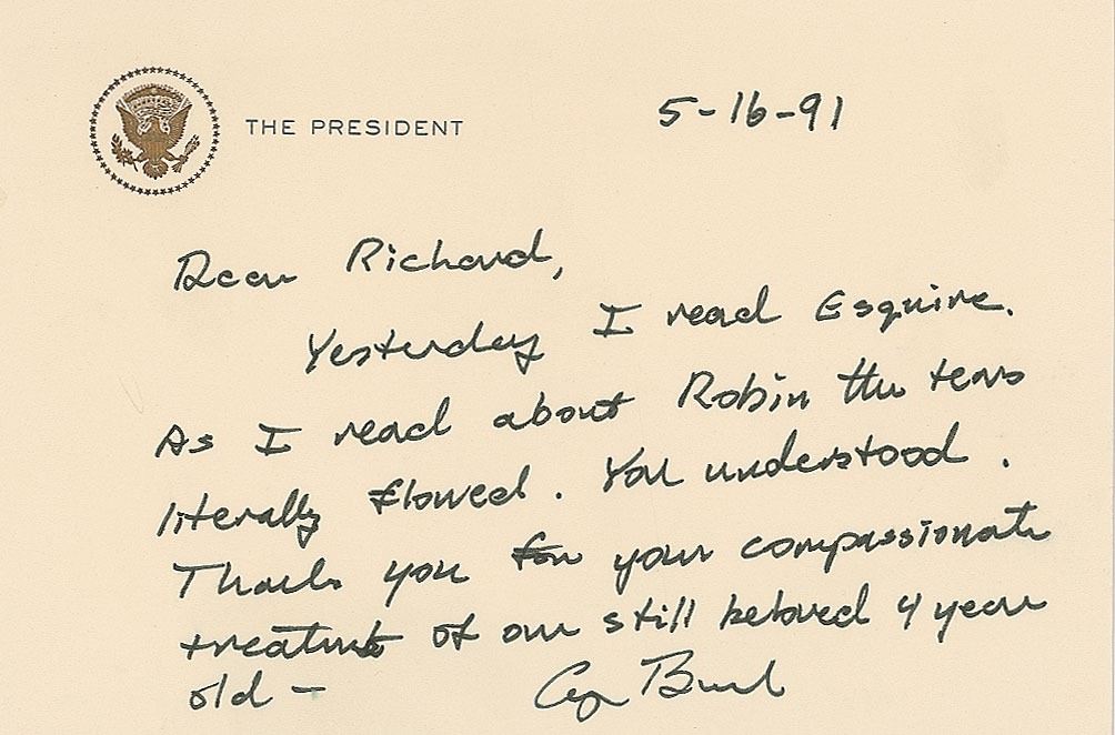 ALS as president signed “George Bush,” one page on a 6.25 x 4.25 presidential stationery card, May 16, 1991. Letter to Pulitzer Prize–winning journalist Richard Ben Cramer, about his article 'How He Got Here.' In full: "Yesterday I read Esquire. As I read about Robin the tears literally flowed. You understood. Thank you for your compassionate treatment of our still beloved 4 year old." In very fine condition.